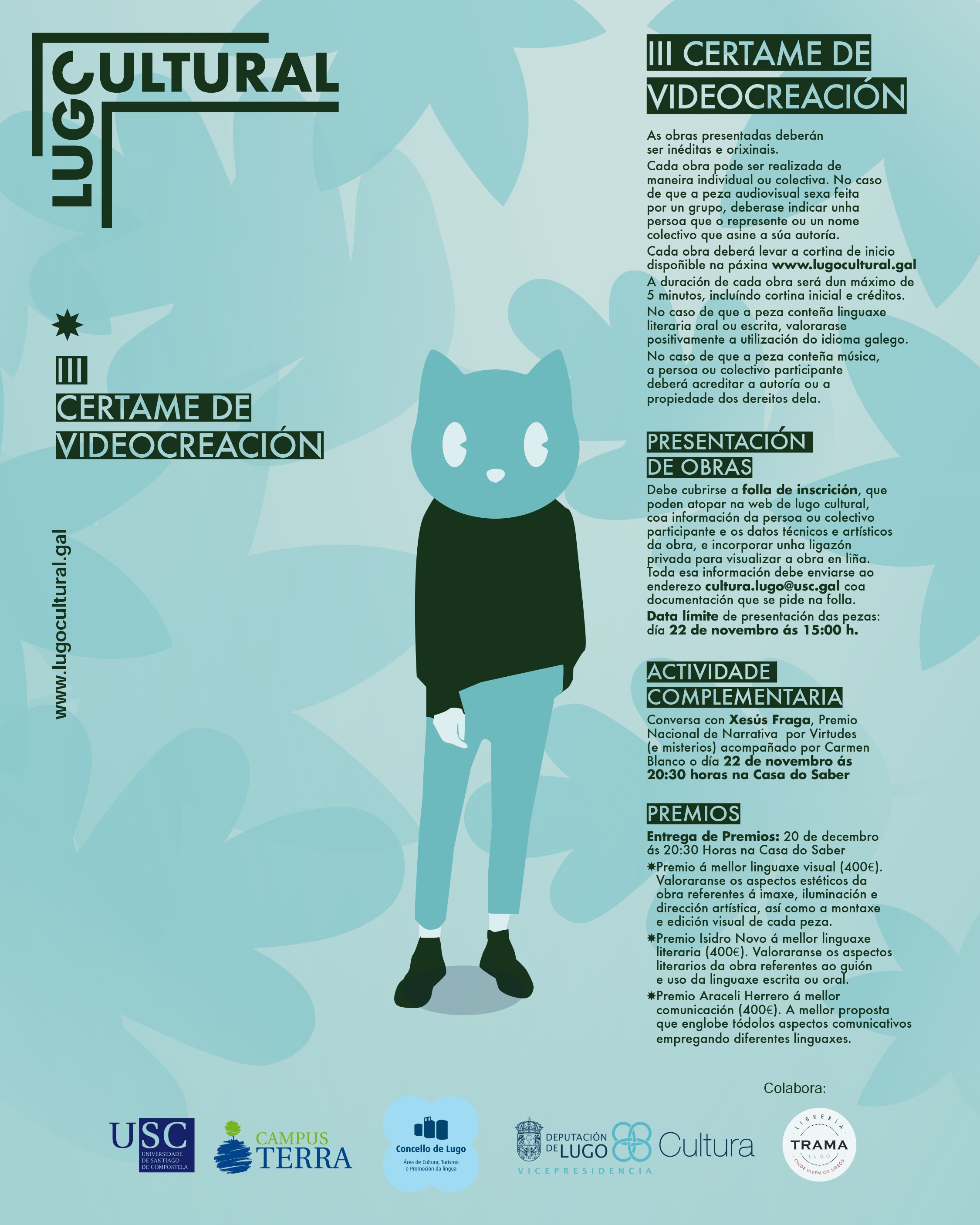 If you want to enjoy the magic of audiovisual creation, register for free by filling in the form on the Lugo Cultural website and sending it to cultura.lugo [at] usc.es (cultura[dot]lugo[at]usc[dot]es). At this same address, you can also register to participate in the Photomarathon until Friday, November 12th at 13:00 h.
