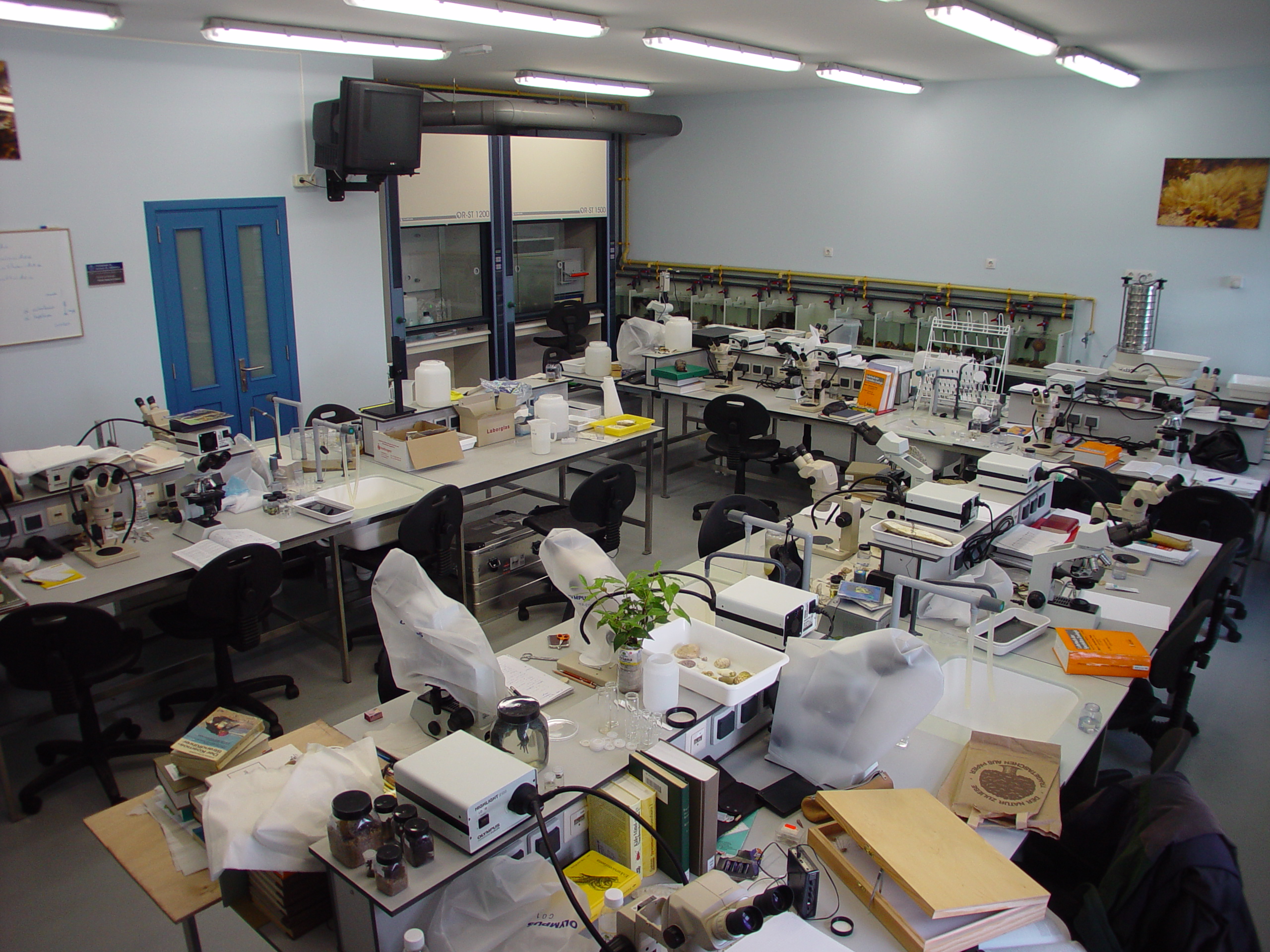 - Teaching laboratory for 24 students equipped with a stereomicroscope and a microscope for each student and for the teacher; it also has a closed TV circuit, two fume extraction hoods, a sediment sieve, a muffle, a drying oven, a microtome and other material for histology.