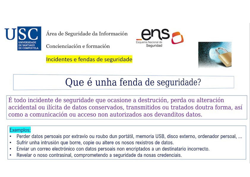 Unha fenda de seguridade prodúcese cando se perden, alteran ou quedan expostos os datos cos que traballamos ou cando sufrimos un incidente que leva asociado un risco de intrusión no equipamento informático onde eses datos se almacenan.