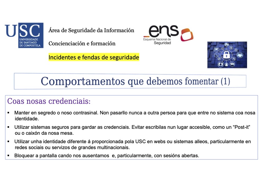 Nas imaxes seguintes pódense atopar exemplos de situacións consideradas como fendas de seguridade ou que representan ameazas graves para a seguridade dos datos. Ademais, inclúense comportamentos axeitados que debemos observar e fomentar para minimizar os riscos.