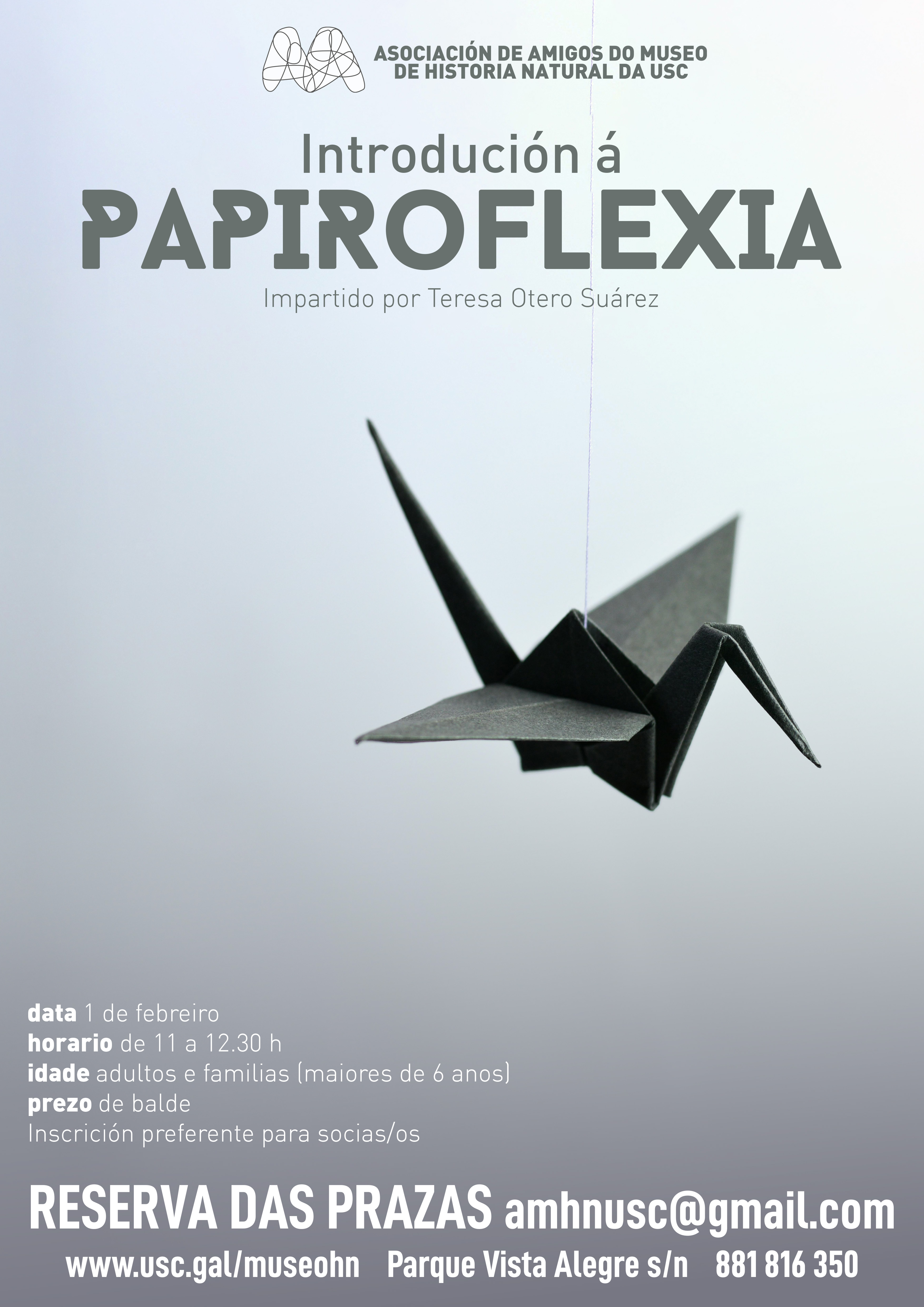 A Asociación de Amigos do MHN organiza o sábado 25 de xaneiro, de 11 a 12:30 horas, o obradoiro para adultos e familias con nenos/as a partir de 6 anos Iniciación á papiroflexia. A actividade estará impartida por Teresa Otero Suárez.