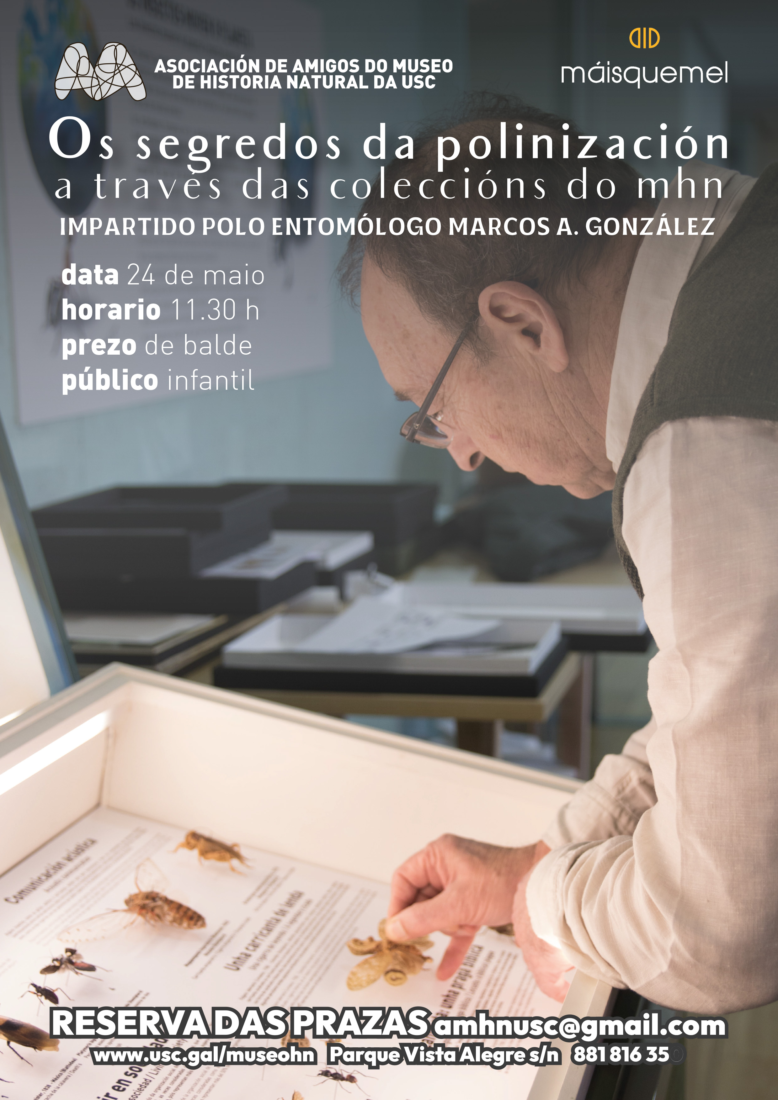 A programación arranca ás 11:30 horas co obradoiro Os segredos da polinización a través das coleccións do MHN, unha actividade pensada para público infantil e familias da man do entomólogo Marcos A. González, catedrático de zooloxía e antigo director do museo. Conta con prazas limitadas a 20 persoas e require inscrición previa no correo amhnusc [at] gmail.com (amhnusc[at]gmail[dot]com)