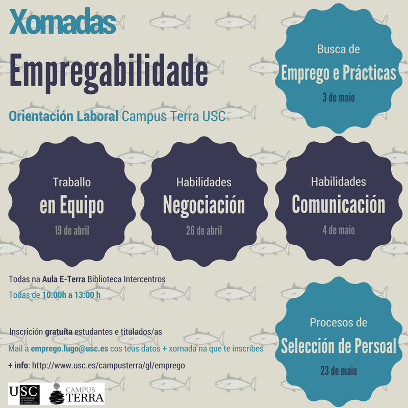 Las sesiones comenzarán el miércoles 19 de abril con una jornada sobre trabajo en equipo, mientras que una semana más tarde, el miércoles 26, se abordarán las habilidades de negociación. Ya en el mes de mayo será el turno de la sesión sobre busca de empleo y prácticas, el 3 de mayo; habilidades de comunicación, el 4 de mayo; y procesos de selección de personal, el 23 de mayo. Para formalizar la inscripción gratuita debe enviarse un correo con los datos personales a emprego.lugo [at] usc.es (emprego[dot]lugo[at]usc[dot]es), indicando el nombre de la jornada en la que se quiere participar. Todas comienzan a las 10:00 horas y terminan a las 13:00 horas.