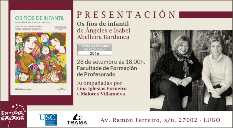Las autoras de ‘Os fíos de infantil’, las maestras Ángeles e Isabel Abelleira, que se hicieron acreedoras de la última edición del premio Marta Mata de Pedagogía por esta obra, presentarán este jueves en la Facultad de Formación del Profesorado de Lugo las claves de esta publicación, en el marco de un acto abierto al público que se desarrollará a partir de las 18.00 horas.