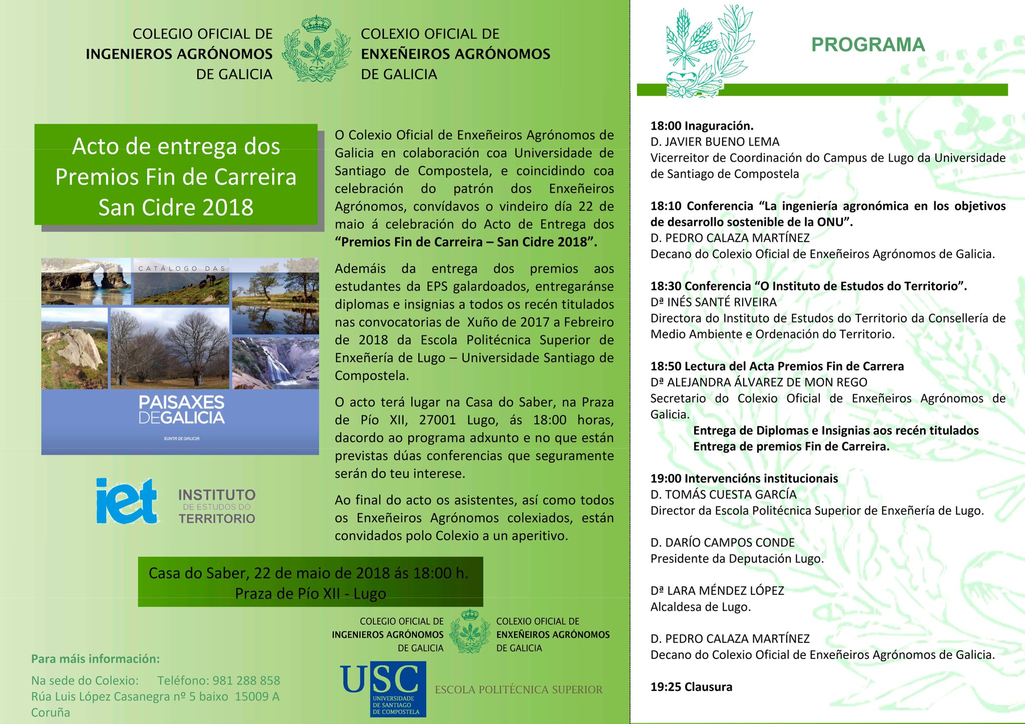 La directora del Instituto de Estudios del Territorio de la Consellería de Medio Ambiente e Ordenación do Territorio, Inés Santé, ofrecerá en esta sesión una ponencia en la que explicará el cometido del ente que dirige. Asimismo, el decano del Colegio oficial de Ingenieros Agrónomos de Galicia también hablará sobre los objetivos de la Ingeniería Agronómica en el desarrollo sostenible, según la ONU.