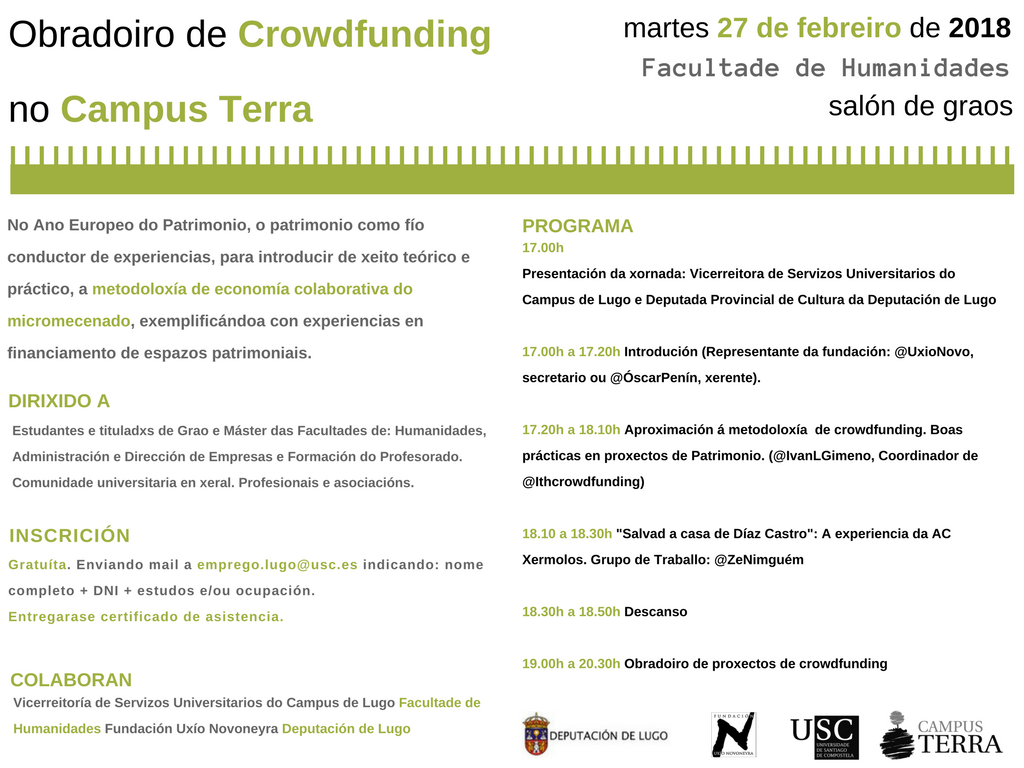 Esta jornada, cuya inscripción puede realizarse de modo gratuito a través de la dirección electrónica emprego.lugo [at] usc.es (emprego[dot]lugo[at]usc[dot]es) indicando nombre completo, DNI, así como los estudios y la ocupación actual; se enmarca en el Año Europeo del Patrimonio y está organizada por la Vicerreitoría de Servicios Universitarios del campus de Lugo, el área de Orientación e Inserción Laboral de la USC en el Campus Terra, la Fundación Uxío Novoneyra y la Diputación de Lugo.