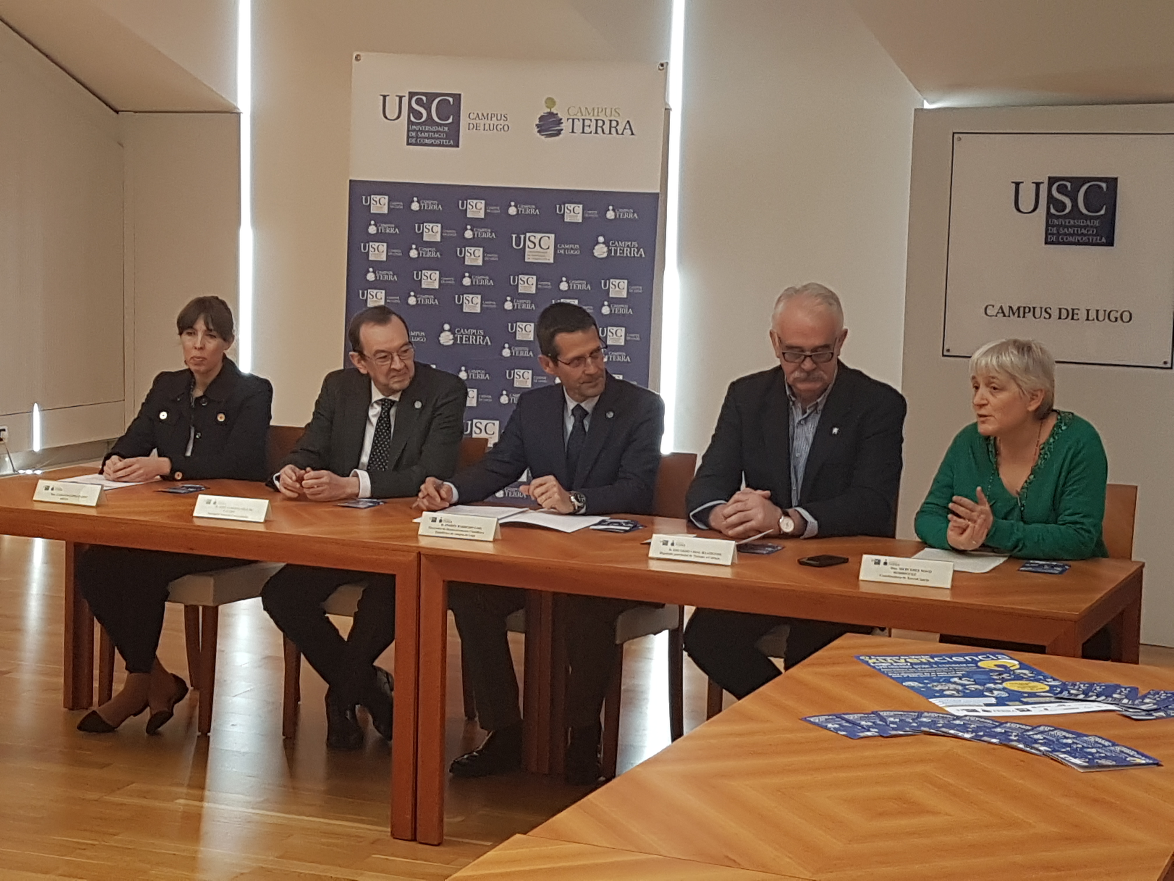 El vicerrector de Desarrollo Científico y Tecnológico del Campus de Lugo, Andrés Barreiro Lois; la profesora de la USC y coordinadora del campus de verano XuvenCiencia Lugo, Mercedes Novo Rodríguez; el secretario general de Universidades, José Alberto Díez de Castro; el diputado provincial de Turismo y Cultura, Eduardo Vidal Baamonde; y Carlota López Pardo, en representación de la empresa patrocinadora Aresa, presentaron este jueves en la Vicerrectoría de Coordinación del campus de Lugo la nueva edición del campus de verano XuvenCiencia, un proyecto de divulgación científica con más de 104 eventos programadas y avalado por la participación de unos 146 docentes de la USC y otro personal de apoyo.