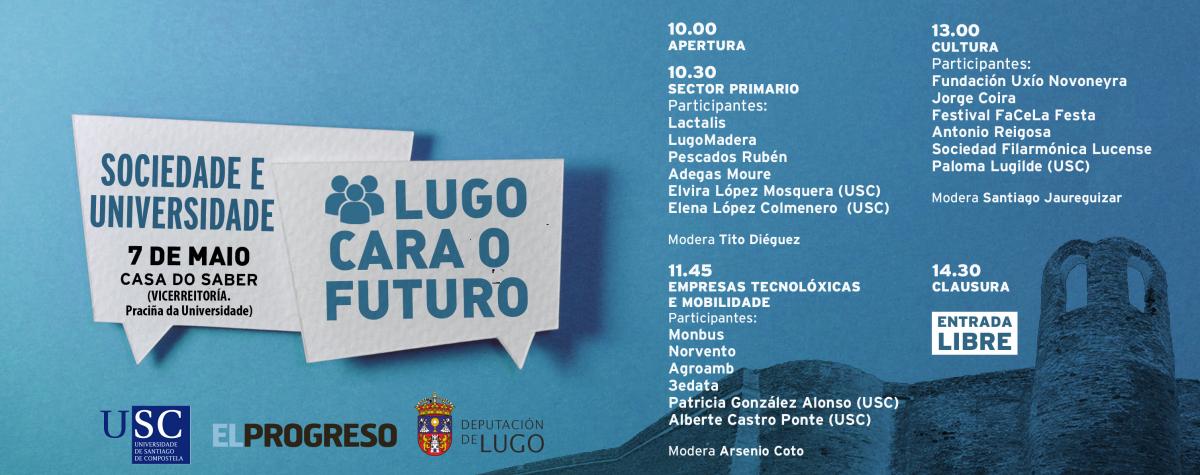 A USC, en colaboración con El Progreso, organiza a xornada ‘Lugo cara o futuro. Sociedade e Universidade’ que se celebrará a mañá do vindeiro martes 7 de maio na Casa do Saber, a partir das 10.00h, e na que diferentes relatores abordarán eidos estratéxicos para a provincia e para a comunidade no seu conxunto como é o caso do sector primario, a tecnoloxía, a mobilidade e a cultura.