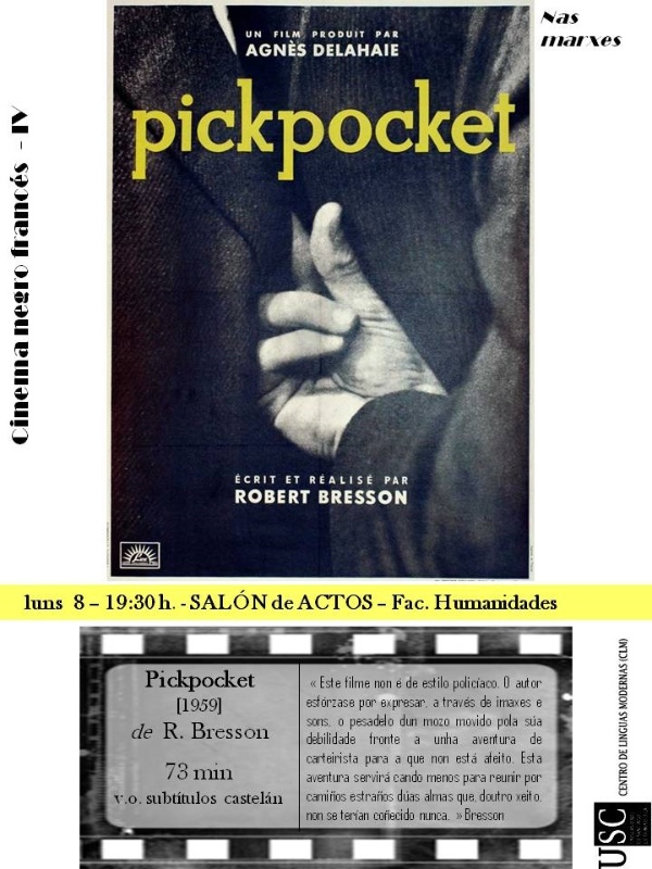 El ciclo de cine negro, una programación promovida por la sección de francés del Centro de Lenguas Modernas en el Campus Terra, continúa este lunes 8 de mayo, a las 19:30 horas, en el salón de actos de la Facultad de Humanidades con la proyección de ‘Pickpocket’, un film realizado en 1959 por Robert Bresson, que podrá verse en versión original con subtítulos en español.