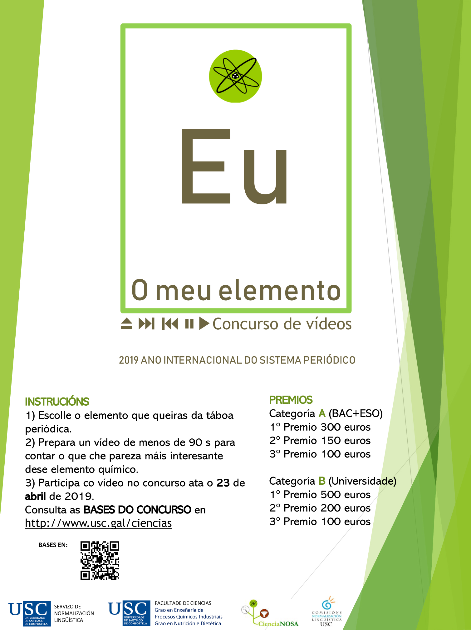 A Facultade de Ciencias do Campus Terra da USC vén de convocar o concurso de vídeos ‘O meu elemento’, en colaboración co grupo de innovación docente CienciaNOSA e o Servizo de Normalización Lingüística da USC, no que cada participante ou grupo participante preparará un vídeo sobre un elemento químico en lingua galega, debendo envíalo ata o 24 de abril de 2019, inclusive, ao enderezo electrónico fcdeca [at] usc.es (fcdeca[at]usc[dot]es) ou ao enderezo físico que aparece nas bases do certame.