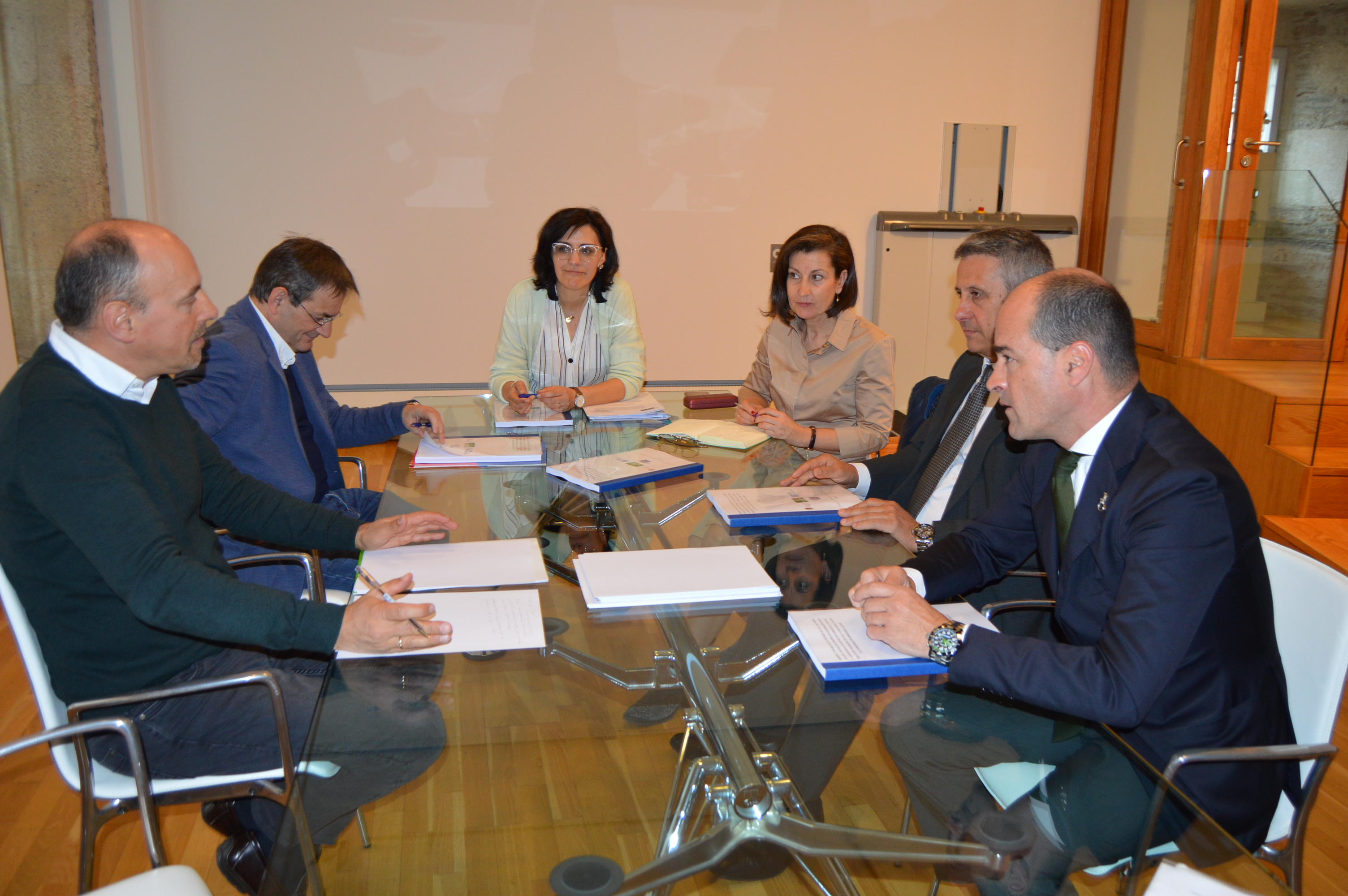 A vicerreitora de Coordinación do campus de Lugo Montserrat Valcárcel, a adxunta para Investigación, Transferencia e Innovación Elvira López Mosquera, o presidente de Caixa Rural Manuel Varela, o xefe do servizo de contratación da Deputación Provincial de Lugo Manuel Ángel Jove Losada, o secretario da Confederación de Empresarios de Lugo Jaime Luis López Vázquez, e o técnico da Oficina de Información e Transferencia da USC en Lugo Ramón Mazoy Fernández reuníronse na comisión de seguimento do convenio para aprobar a súa renovación de cara á vindeira anualidade.