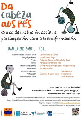 La residencia universitaria Jesús Bal y Gay del Campus Terra de la USC acogerá los próximos días 30 de septiembre, 1, 7 y 8 de octubre el curso "De la cabeza a los pies", un programa de inclusión social y participación que está abierto a todo el público interesado. Las personas interesadas en participar como asistentes en esta actividad formativa, que será reconocida con un crédito ECTS optativo para el alumnado de cualquier titulación de la USC, pueden formalizar su inscripción en la web de la USC hasta el próximo 25 de septiembre.