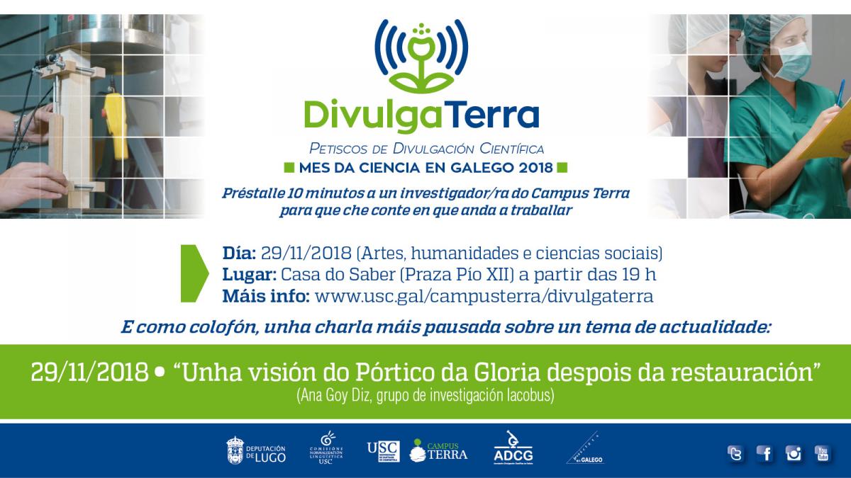 A terceira edición de DivulgaTerra, o evento que pretende divulgar entre a cidadanía o traballo dos investigadores e investigadoras do Campus Terra da USC empregando a lingua galega, chega á súa derradeira xornada cunha sesión dedicada ás Artes, Humanidades e Ciencias Sociais, que terá como colofón un relatorio da profesora da USC Ana Goy sobre o Pórtico da Gloria trala restauración e que terá lugar este xoves 29 de novembro, ás 19.00h, na Casa do Saber.