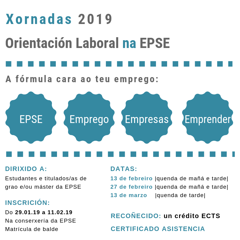 A Escola Poliécnica Superior de Enxeñaría organiza en colaboración coa Vicerreitoría de Coordinación do campus de Lugo e coa Área de Orientación e Inserción Laboral da USC no Campus Terra, tres xornadas para informar aos seus estudantes e titulados/as verbo das competencias para atopar emprego e de estratexias de emprendemento os días 13 e 27 de febreiro, así como o 13 de marzo.