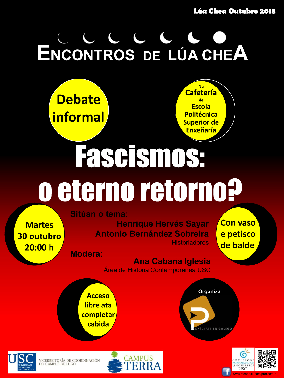 Neste encontro, enmarcado nos denominados ‘Encontros de Lúa Chea’, organizados para divulgar contidos académicos transversais de interese xeral ou de actualidade universitaria, e  cuxo acceso é aberto e de balde, preténdese responder ás seguintes cuestións: por que agroman periodicamente na sociedade ideas de corte fascista, como o racismo ou o totalitarismo? Hai paralelismos entre a forma en que agromaron os movementos fascistas no primeiro terzo do século XX e o xeito en que medran agora? Podemos aprender algunha lección da historia pasada para evitar volver repetila?