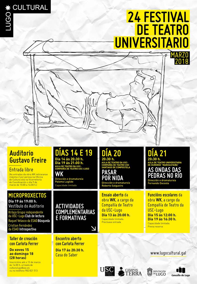 El 20 de marzo, a las 20.30 horas, será el turno del aula de Teatro de la USC-Compañía de Teatro USC Santiago de Compostela, que representará la obra Pasar por Nida, bajo la dirección y dramaturgia de Roberto Salgueiro. El día 21, As ondas das pedras no río, a cargo del aula de Teatro Universitaria de Ourense “Maricastaña”, con dirección y dramaturgia de Fernando Dacosta, se representará también a partir de las 20.30 horas. Ambas representaciones tendrán lugar en el Auditorio Gustavo Freire.