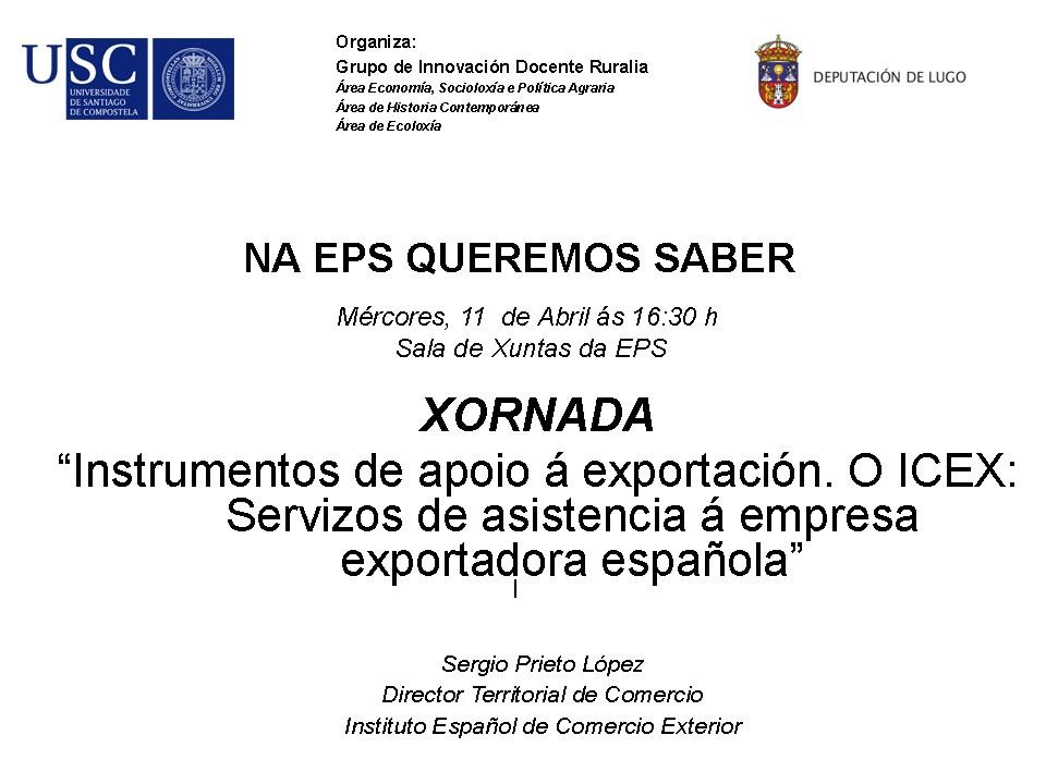 Los instrumentos de apoyo a la exportación y los servicios de asistencia que ofrece el Instituto Español de Comercio Exterior (ICEX) centra este miércoles 11 de abril la temática de una jornada promovida en la Escuela Politécnica Superior de Ingeniería del Campus Terra de la USC por el grupo de innovación docente Ruralia en el marco del ciclo ‘En la EPS queremos saber’.