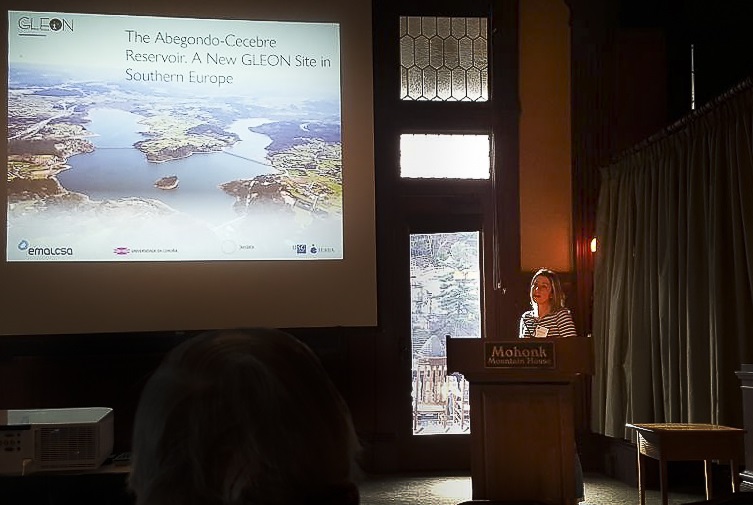 La responsable de I+D de la spin-off de la USC radicada en Lugo 3edata, la doctora ingeniera de Montes Carmen Cillero fue la encargada de presentar el nuevo Gleon Site del embalse de Cecebre en la última reunión de este colectivo internacional celebrada en la localidad de New Paltz (Nueva York), una sesión en la que también participó el doctor en Geología y experto en limnología de la UDC Jordi Delgado Martín.