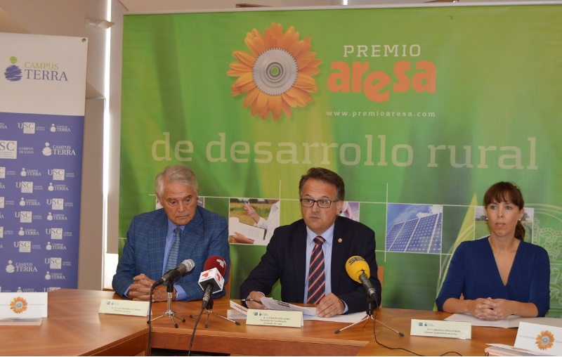 El vicerrector de Coordinación del Campus de Lugo, Javier Bueno Lema, y el presidente de Aresa, Álvaro Rodríguez Eiras, además de Carlota López, directora adjunta del grupo empresarial de suministros agroganaderos, dieron a conocer esta mañana en la capital lucense las bases de la nueva convocatoria del Premio Aresa de Desarrollo Rural, un galardón de reconocido prestigio que va ya por su 17 edición.
