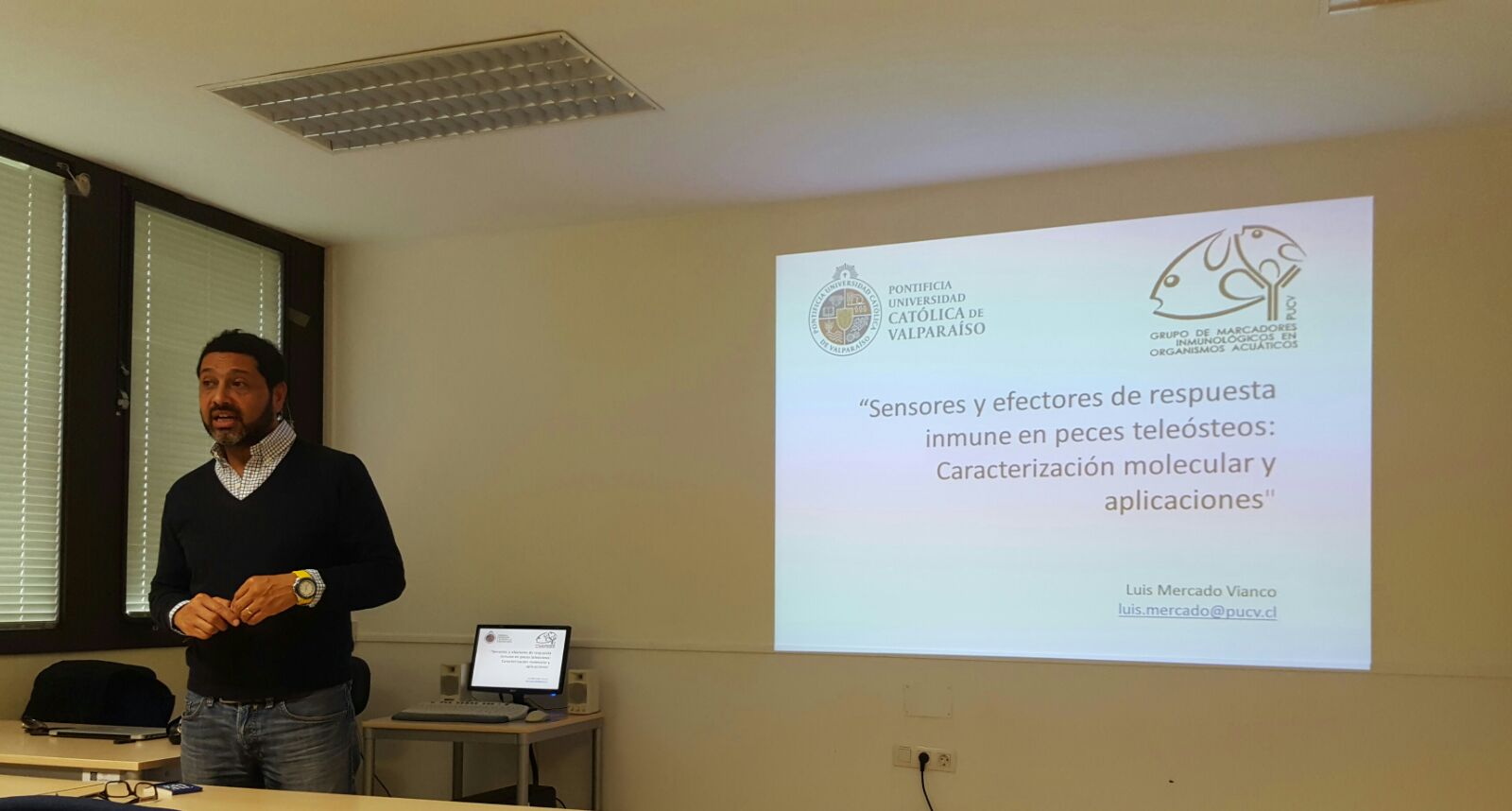 El doctor por la Universidad de Santiago de Compostela y profesor de la Pontificia Universidad Católica de Valparaíso en Chile, Luis Mercado, impartió este lunes, en la Facultad de Veterinaria del Campus Terra de la USC, una conferencia sobre los peces teleósteos y qué marcadores de respuesta inmune estudiar en los mismos. Esta investigación se justifica en base a que Chile es el mayor productor de truchas en el mundo, y el segundo mayor productor de salmónidos, después de Noruega, superando ya las 700.000 toneladas anuales, lo que ha provocado un incremento de patógenos y resistencia de éstos a los antibióticos y otras profilaxis.