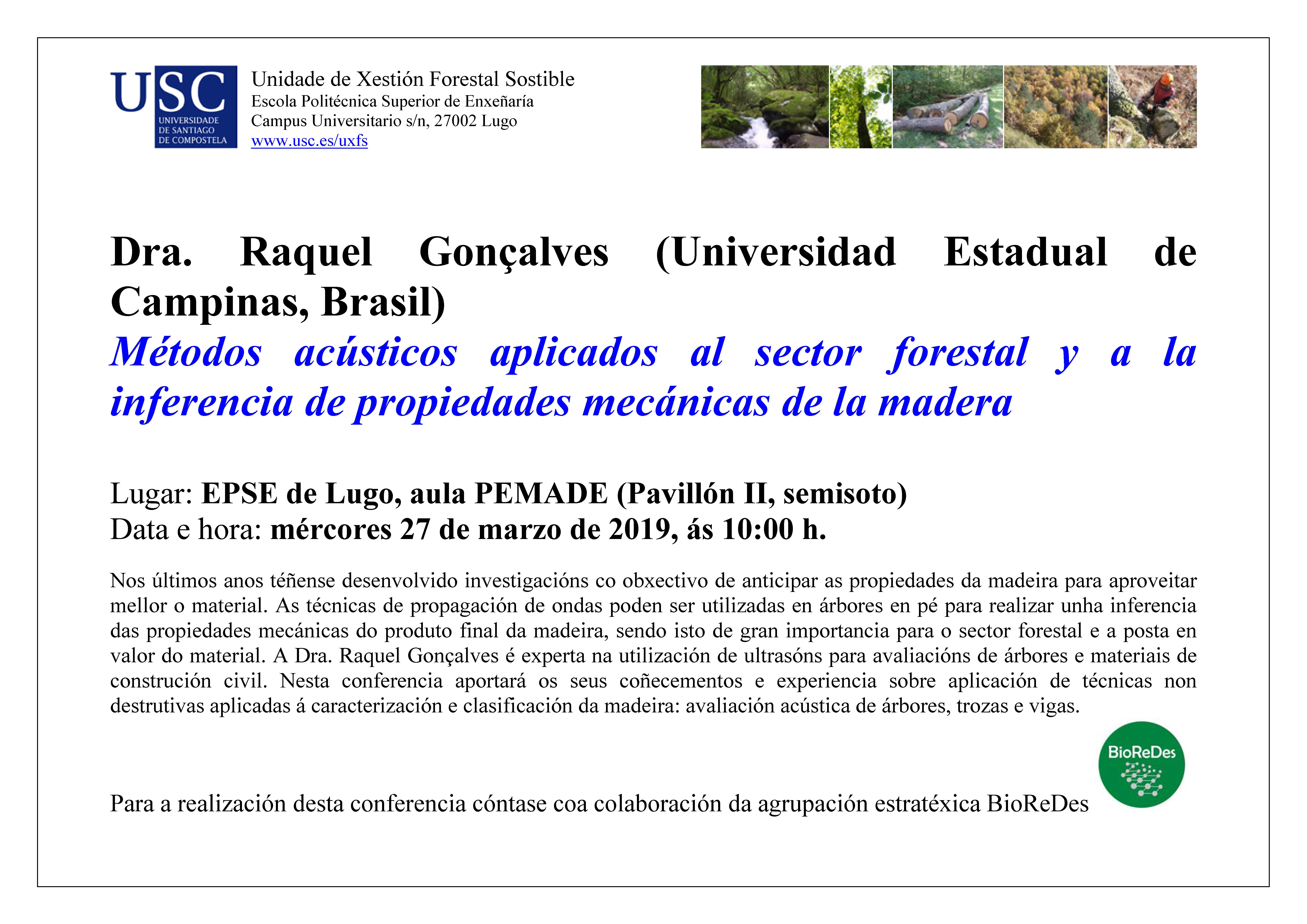 A profesora da Universidade Estatal de Campinas en São Paulo (Brasil), Raquel Gonçalves, imparte este mércores, a partir das 10.00h, na aula PEMADE da Escola Politécnica Superior de Enxeñaría, unha conferencia sobre os métodos acústicos aplicados ao sector forestal e a inferencia de propiedades acústicas da madeira, no marco das actividades impulsadas pola Agrupación Estratéxica de Investigación do Campus Terra BioReDes.