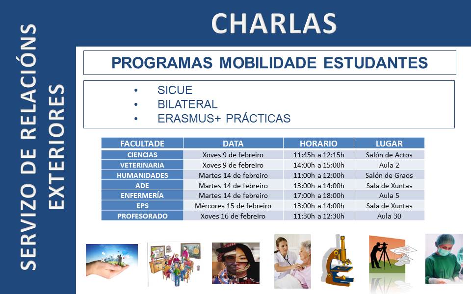 En el salón de grados de la Facultad de Humanidades, a partir de las 11:00 horas, y en el aula 5 de Enfermería, a las 17:00 horas, los asistentes podrán obtener información sobre el Sistema de Intercambio entre Centros Universitarios Españoles (SICUE), los convenios bilaterales de los que forma parte la USC, y el Programa Erasmus + Prácticas, cuya finalidad consiste en contribuir a que el alumnado se adapte a las exigencias del mercado laboral a escala comunitaria y mejore su comprensión del contorno económico y social del país en el que se encuentra. El jueves 16, se celebrará la última de las sesiones en la Facultad de Formación del Profesorado.