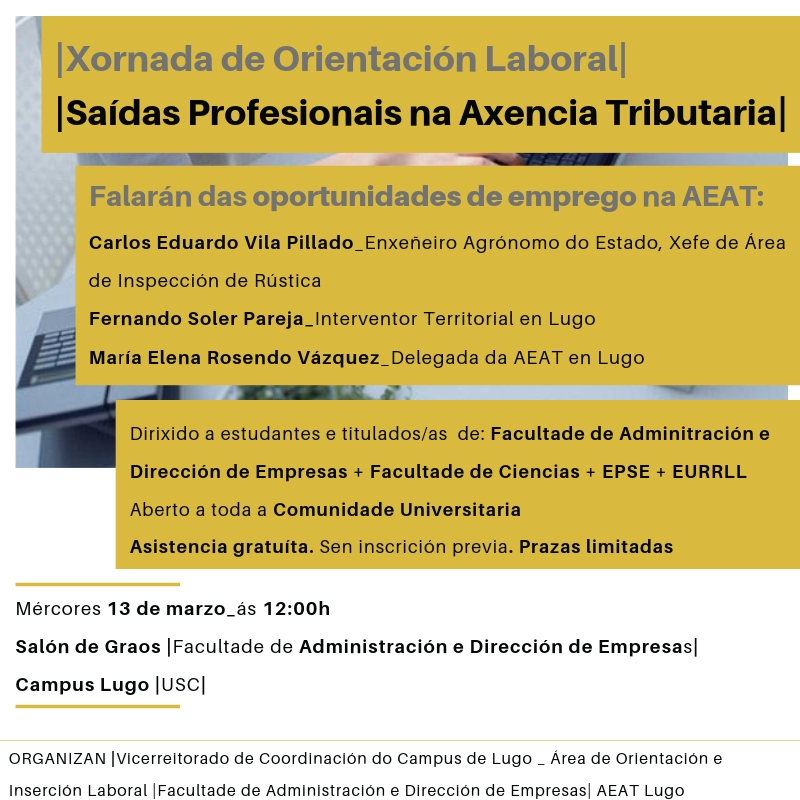 O salón de graos da Facultade de Administración e Dirección de Empresas de Lugo acolle o mércores 13 de marzo, a partir das 12.00h, a xornada ‘As saídas profesionais na Axencia Tributaria’, organizada polo propio centro, a Vicerreitoría de Coordinación do campus de Lugo, a Área da Orientación e Inserción Laboral, así como pola AEAT.