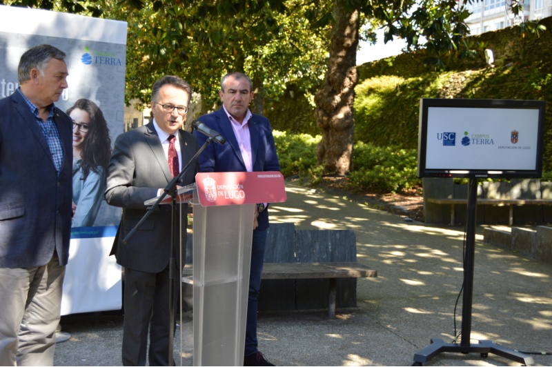 El vicerrector de Coordinación del campus de Lugo, Javier Bueno, el presidente de la Diputación de Lugo, Darío Campos Conde, y el concejal de Educación del Ayuntamiento de Lugo, Manuel Núñez, presentaron este miércoles en los jardines del Pazo de San Marcos ‘Para estudiar, Lugo’, una campaña de promoción de Lugo como ciudad universitaria y que ofrece descuentos del 50% en el coste de la matrícula a los nuevos estudiantes de primer curso en 10 titulaciones de grado ofertadas por la USC en los distintos centros del Campus Terra.