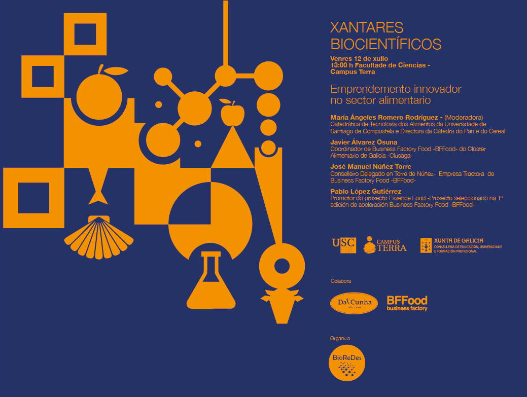A Agrupación Estratéxica do Campus Terra da USC, BioReDes, organiza na Facultade de Ciencias unha nova edición dos seus ‘Xantares Biocientíficos’ este venres 12 de xullo, a partir das 13.00h, dedicada ao emprendemento innovador no sector agroalimentario.