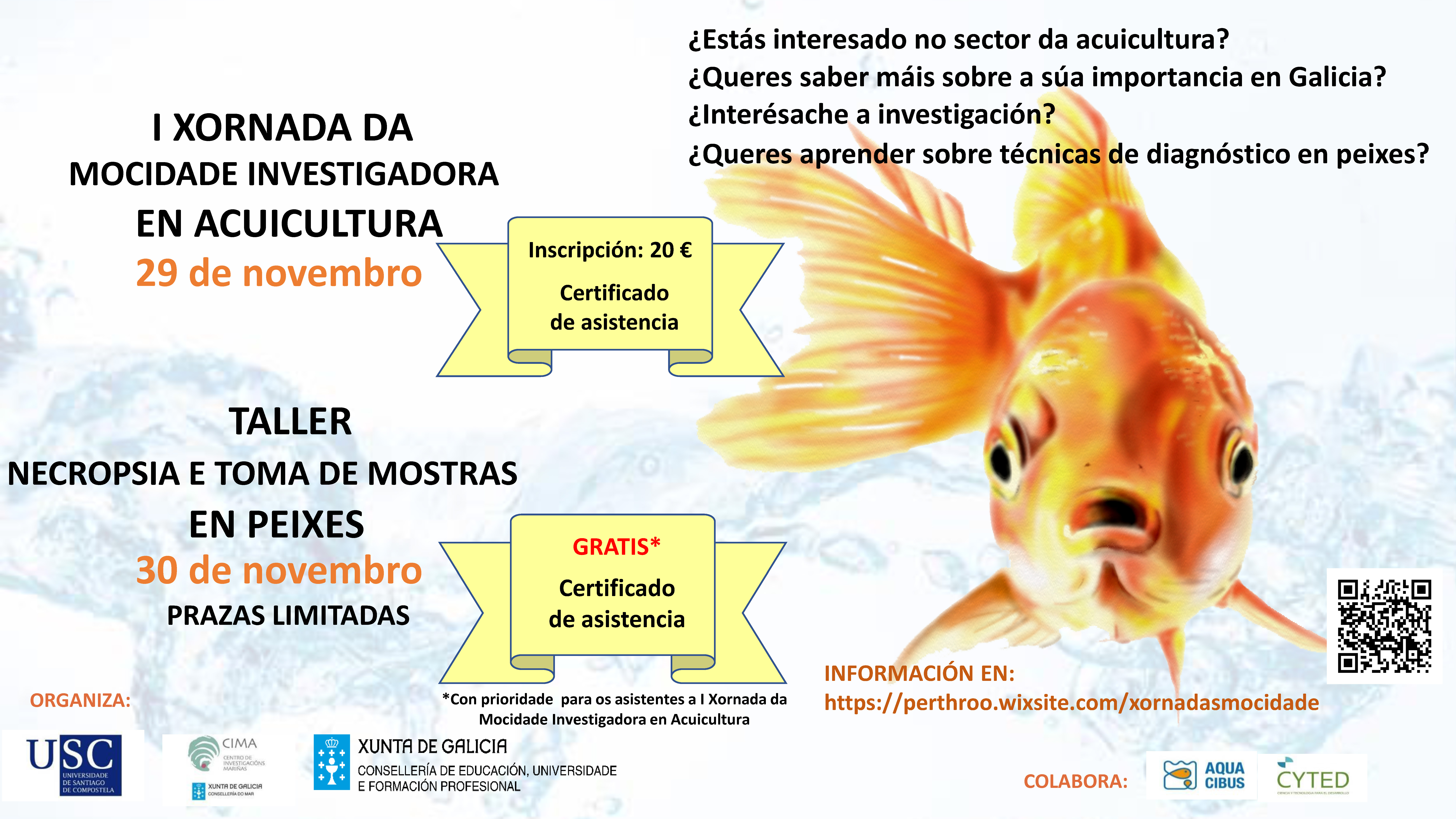 A rede de Inmunoxenómica de Enfermidades de Peixes e Moluscos, formada por investigadores da Universidade de Santiago de Compostela e do Centro de Investigacións Mariñas de Corón, organiza a I Xornada da Mocidade Investigadora en Acuicultura que terá lugar na Facultade de Veterinaria o vindeiro 29 de novembro e cuxo prazo de inscrición ampliouse ata o 26 de novembro.