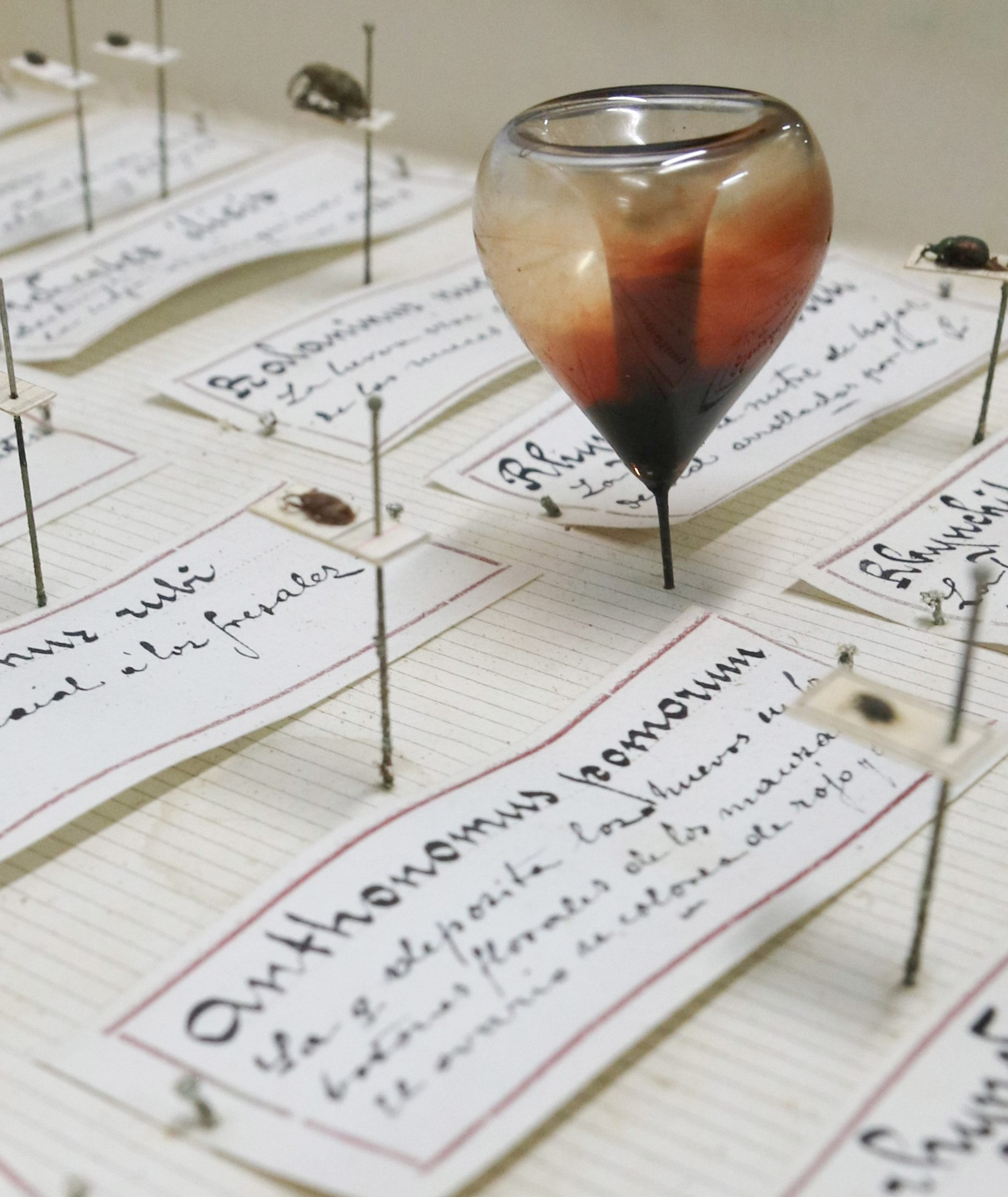 Para evitar estas pragas nas coleccións entomolóxicas, era frecuente a utilización dunhas pequenas ampolas de vidro -como a que podemos ver na foto- chamadas fiolas, nas que se introducía unha pequena cantidade de creosota de faia, un líquido praguicida, moi usado para tratar madeiras. Os bafos desta substancia despréndense lentamente e pode repoñerse de ser necesario. As pequenas fiolas teñen diversas formas pero todas posúen no extremo unha punta a modo de alfinete que permite picalos no fondo das caixas. Este sistema con creosota, ou outras substancias como o alcanfor ou solucións fenólicas, deixou de utilizarse. Na actualidade recoméndase a conxelación controlada durante períodos non moi longos.
