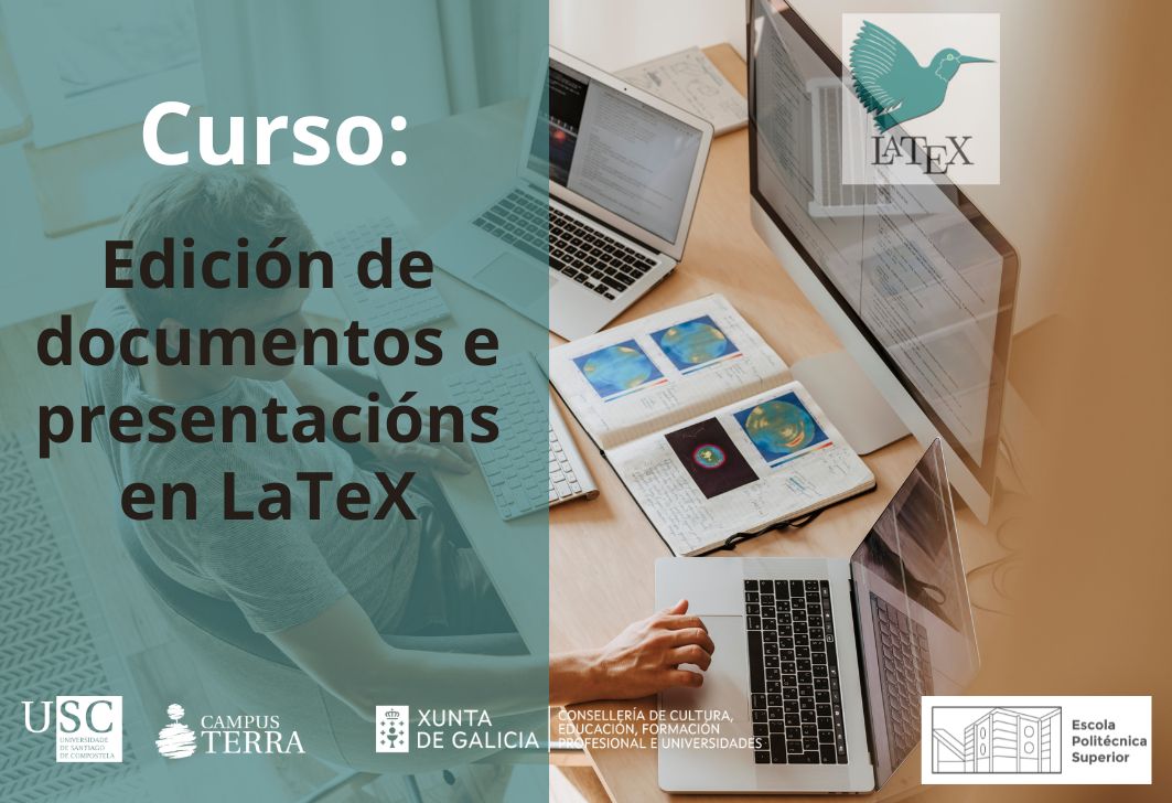 O Campus Terra da USC achega formación a alumnado de grao e mestrado, así como a persoal docente e investigador, sobre edición de documentos e presentacións en LaTeX a través dun curso coordinado por Fernando Rafael Pardo Seco que comezará a impartirse o 29 de abril, a partir das 10.00 horas, na Escola Politécnica Superior de Enxeñaría. A inscrición deste módulo formativo, cuxas sesións se estenderán ata o 6 de maio, está aberta en liña.