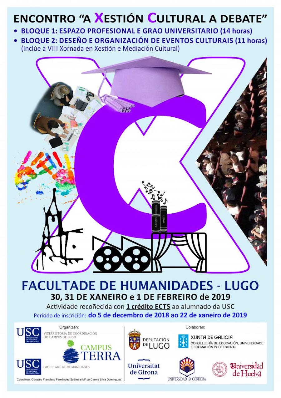 Nos dous últimos cursos académicos, a Facultade de Humanidades de Lugo protagonizou unha serie de iniciativas destinadas a definir en maior medida o seu espazo profesional e formativo. Neste contexto desenvolvéronse en 2017 as xornadas "A xestión cultural como espazo profesional", durante as cales diversos actores deste sector compartiron connosco variados aspectos ligados ao emerxente perfil laboral do xestor cultural, tanto dentro de espazos públicos como na iniciativa privada. Froito dos contactos que a Facultade estableceu con outros centros de ensino que imparten titulacións de grao de xestión e comunicación cultural xorde agora este encontro "A xestión cultural a debate", no que compartiremos con compañeiros das Universidades de Córdoba, Huelva e Girona, diversos aspectos relacionados cos nosos títulos: as súas relacións cos ámbitos humanísticos clásicos, as novas necesidades formativas dos seus docentes, os seus espazos propios de investigación, as características específicas dos seus Traballos fin de Grao, os procesos de fomento da empregabilidade dos nosos egresados, etc. As xornadas son tamén de gran interese para o noso alumnado, que as poderá complementar cun monográfico en deseño e organización de eventos a celebrar a continuación. Por último e dado o carácter emerxente do espazo profesional dos xestores culturais, todas aquelas persoas interesadas neste ámbito certamente atoparán sesións nas que se desenvolvan temas do seu interese.