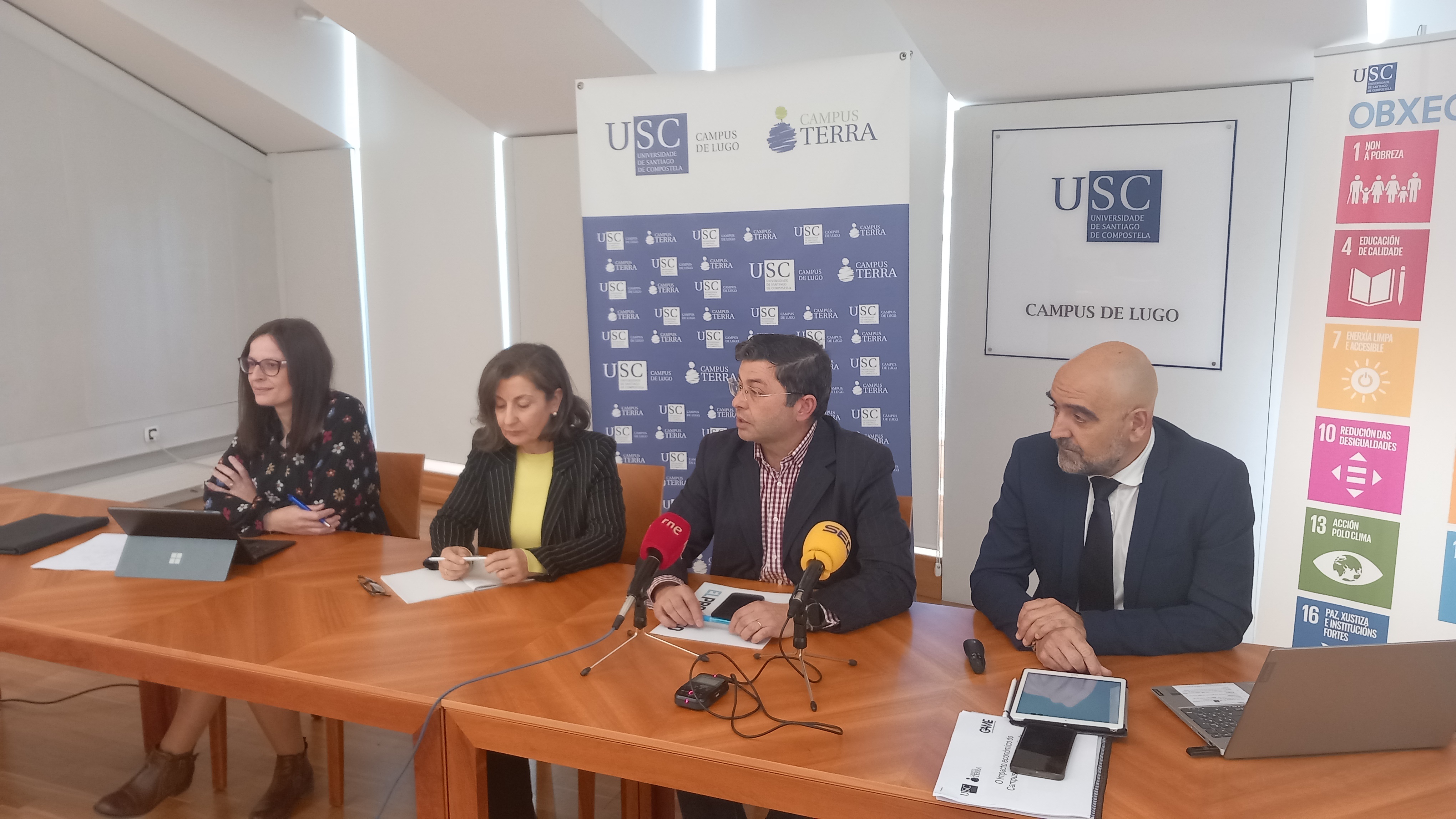 O valor total da produción da provincia de Lugo vinculada ao Campus Terra da USC superou, en 2023, os 75 millóns de euros. Esta cifra é unha das principais conclusións do informe titulado ‘O Impacto económico do Campus Terra na provincia de Lugo’ que este venres 29 presentaron, nun encontro cos medios de comunicación que se desenvolveu no Pazo de Montenegro, o vicerreitor de Organización Académica e Campus de Lugo, Francisco Fraga; a delegada do reitor para o Campus Terra, Elvira López Mosquera; e o responsable do informe e decano da Facultade de Administración e Dirección de Empresas do Campus de Lugo, Roberto Bande.