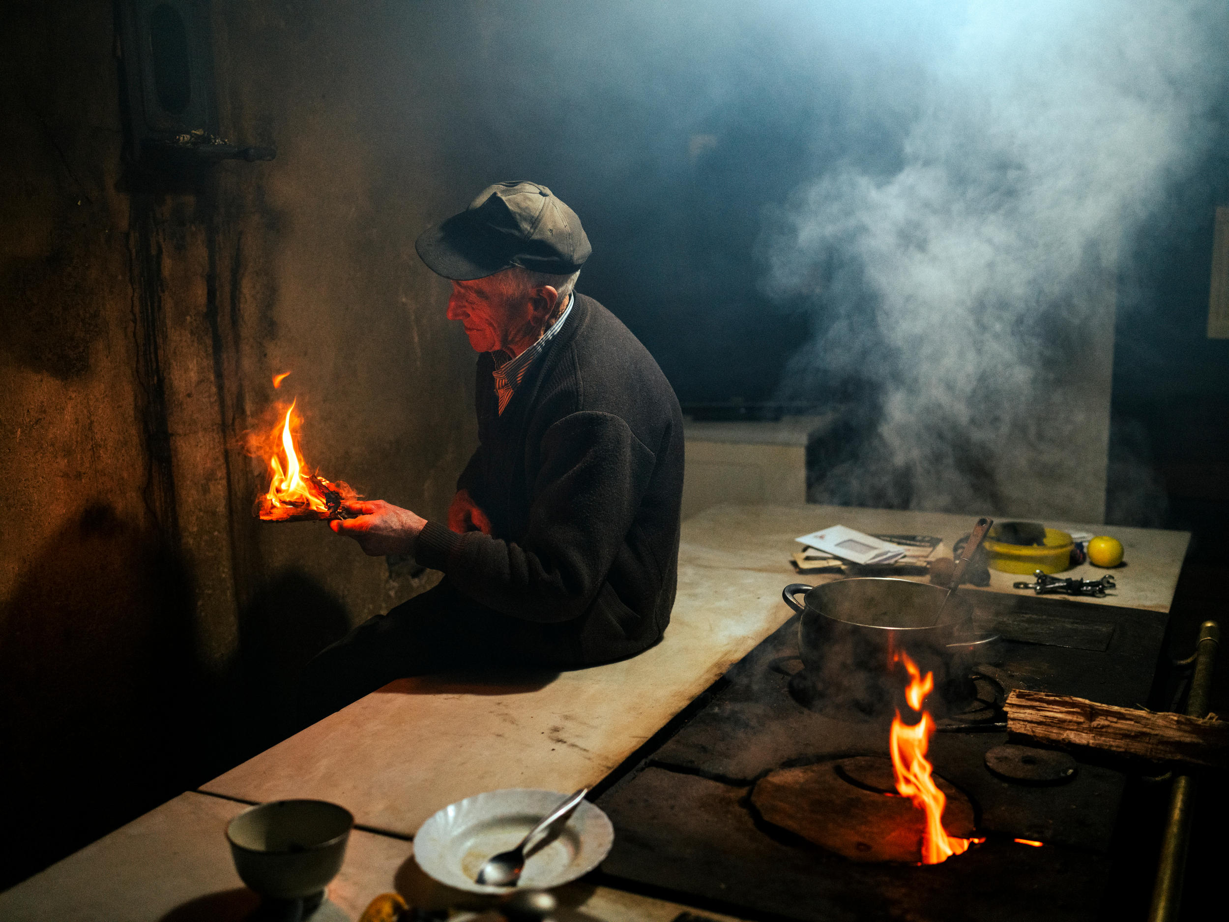 -Pois, eu quedo cunha de Domingo, un habitante dunha das aldeas retratadas de A Fonsagrada, facendo lume no interior da súa casa, onde se ve tamén o tiro da cociña. Tamén escollería unha dun castiñeiro que está ardendo en Vilar, en Folgoso do Courel. Paréceme moi interesante este binomio, xa que representa esa transición do lume interior, vencellado a ese elemento que controlamos, que nos protexe, que nos da calor, a ese mesmo lume que o destrúe todo de forma descontrolada.