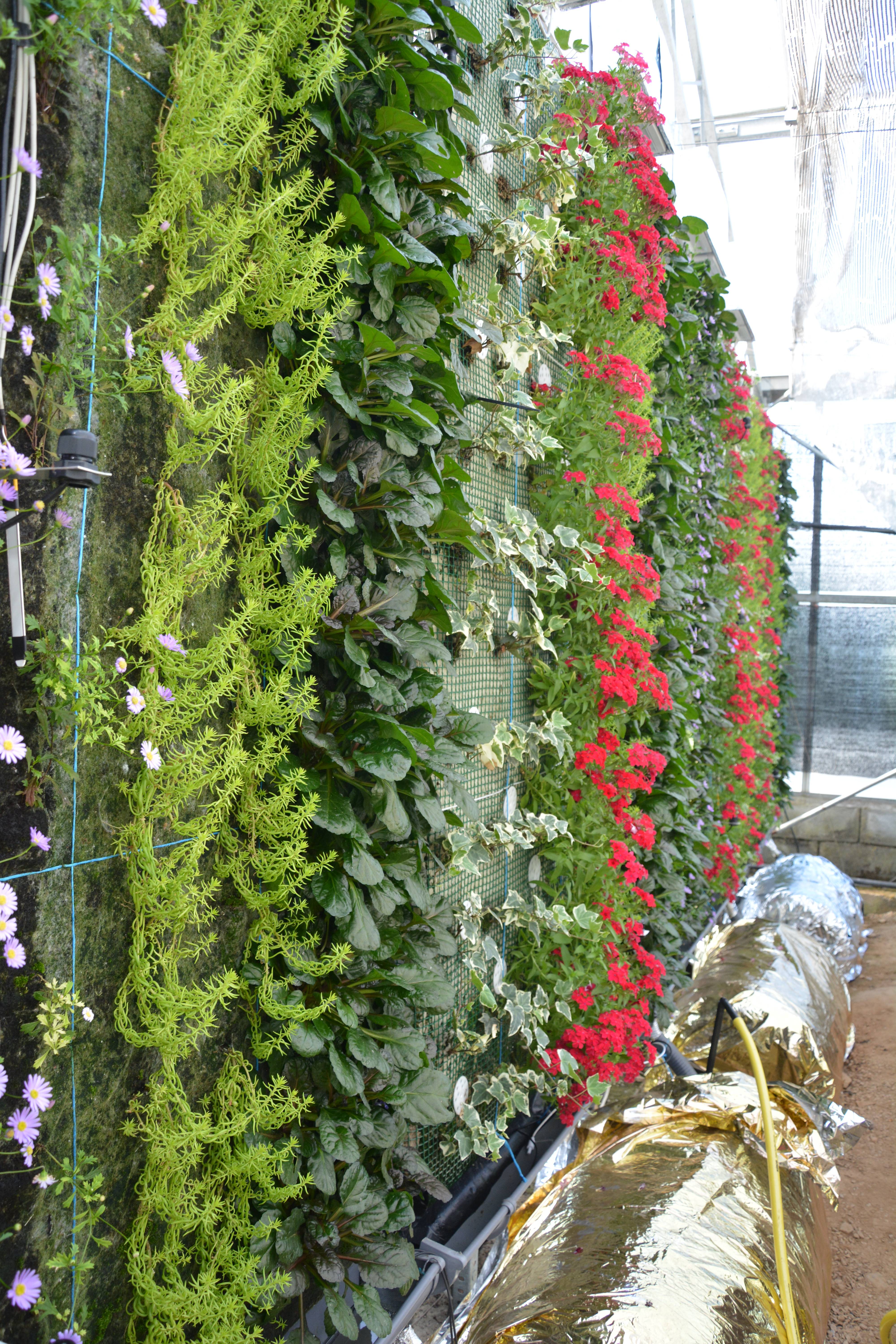 A seguinte fase do proxecto consistiu na montaxe de módulos de xardíns verticais de 2 metros de alto e 1,5 metros de ancho con sistema hidropónico recirculante. En concreto, comparáronse dous sistemas de soporte: un de tea con petos fabricados in situ por grampado a partir de tecido reciclado; e outro de la de rocha. En tres paneis de cada sistema comparouse o crecemento e a adaptación ás distintas posicións no xardín das cinco especies anteriormente seleccionadas, para o que cada unha instalouse verticalmente en dúas columnas dentro de cada panel. O crecemento e a cubrición do panel por cada especie séguese mediante análise de imaxe.
