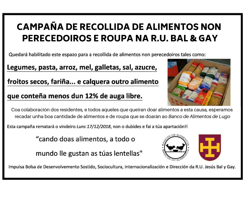 A Residencia Universitaria Jesús Bal y Gay vén de habilitar nas súas dependencias un espazo de recollida de roupa e de alimentos que se doarán ao Banco de Alimentos de Lugo ao abeiro da Bolsa de Desenvolvemento Sostido, Sociocultura, Internacionalización e Dirección.