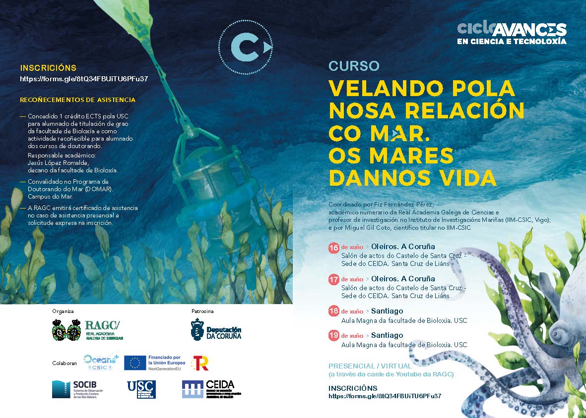 Este curso, recoñecido cun crédito para os estudantes de Grao da Facultade, pretende un achegamento as oportunidades e desafíos relacionados co medio mariño. Organízase en 4 sesións, as dúas primeiras a celebrar na Coruña e as outras dúas en Santiago. Poñerase un autobús ó dispor dos alumnos para atender as sesións de A Coruña.