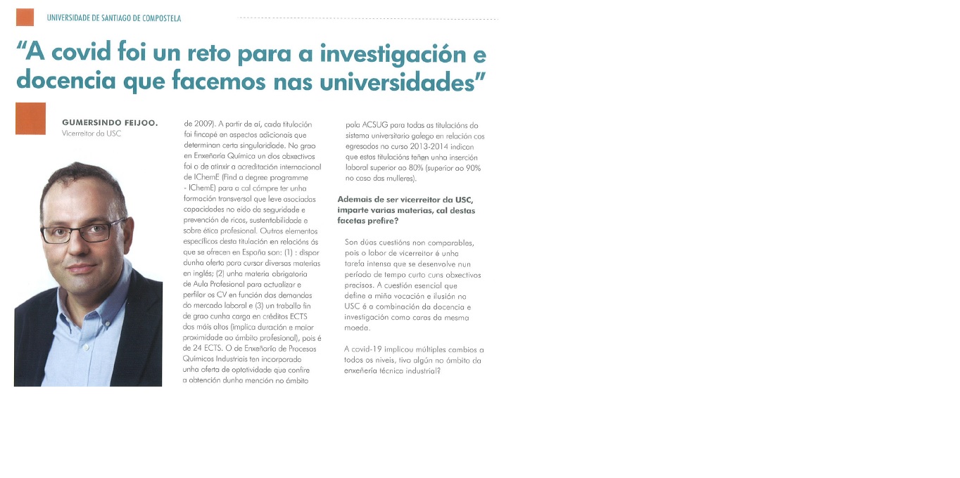 A revista do Colexio Oficial de Enxeñeiros Técnicos Industriais da A Coruña inclue no número 9 do mes de novembro de 2021 unha entrevista ao catedrático do Departamento de Enxeñaría Química da USC, Gumersindo Feijoo, o cal analiza distintos aspectos de interese.