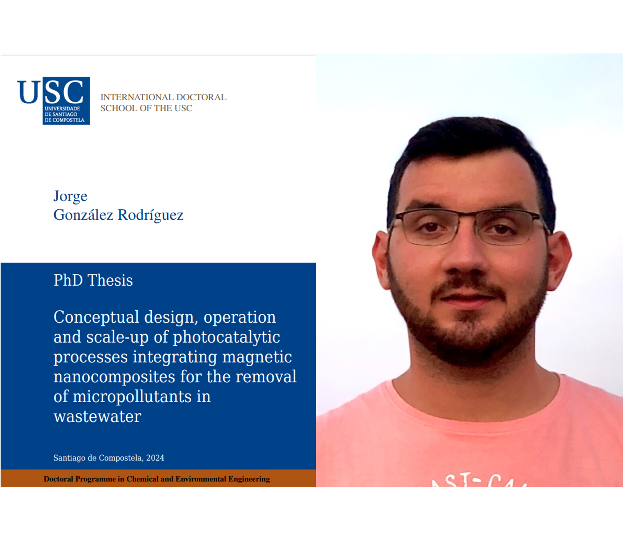 Infórmase que o vindeiro luns 27 de maio ás 12:15 horas terá lugar no salón de actos da ETSE a presentación e defensa presencial da tese doutoral de Jorge González Rodríguez titulada “Conceptual design, operation and scale-up of photocatalytic processes integrating magnetic nanocomposites for the removal of micropollutants in wastewater”. Tese dirixida pola Dra. María Teresa Moreira Vilar e o Dr. Gumersindo Feijoo Costa.