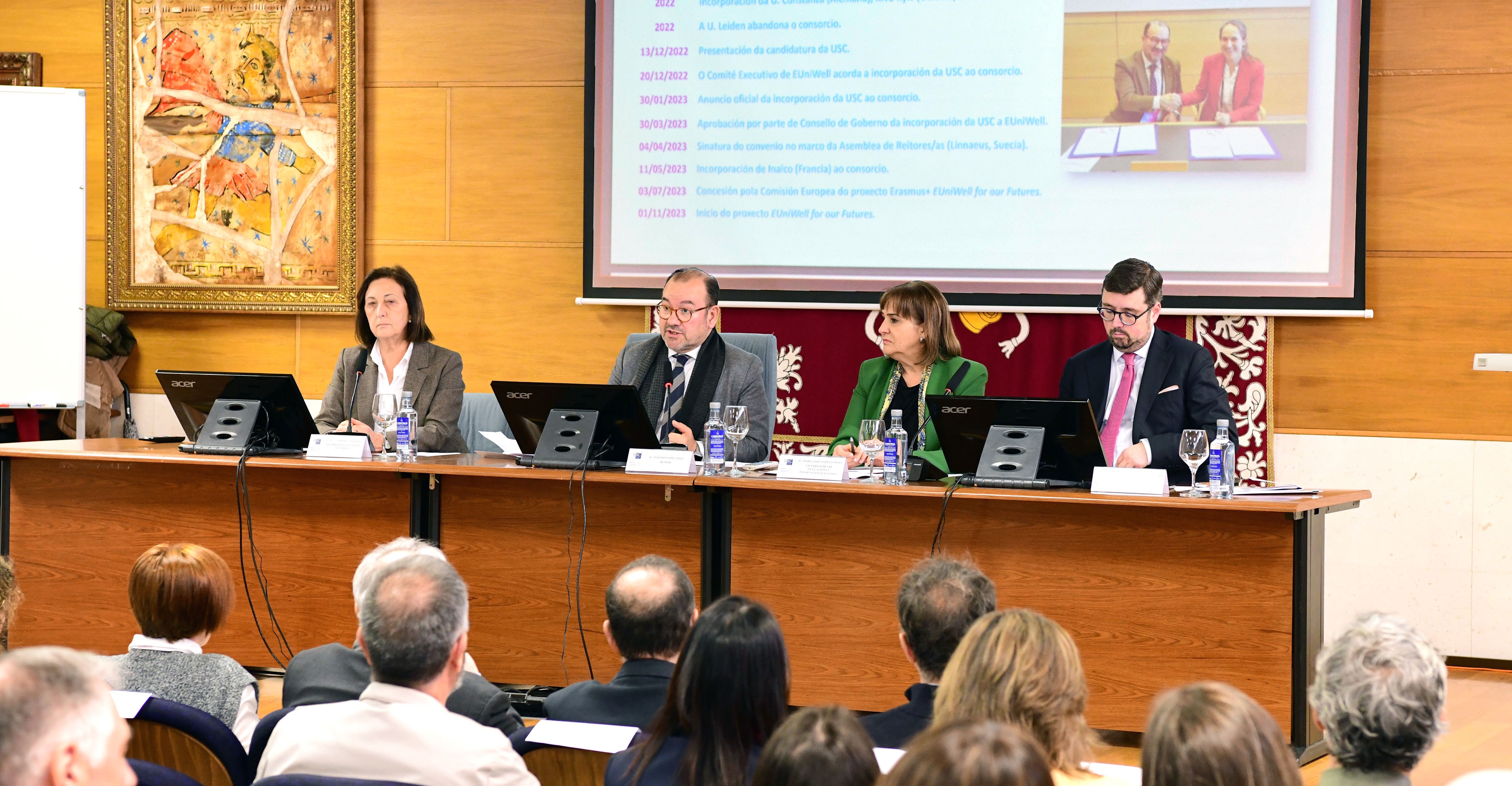 A sesión que se desenvolveu este xoves en Compostela é a segunda presentación que se realiza no consorcio logo do acto que tivo lugar no Campus de Lugo o martes 27. Ademais de con 11 institución socias, EuniWell conta con máis de 120 entidades asociadas, máis de 300.000 estudantes e máis de 41.000 traballadores entre PDI e PTXAS.