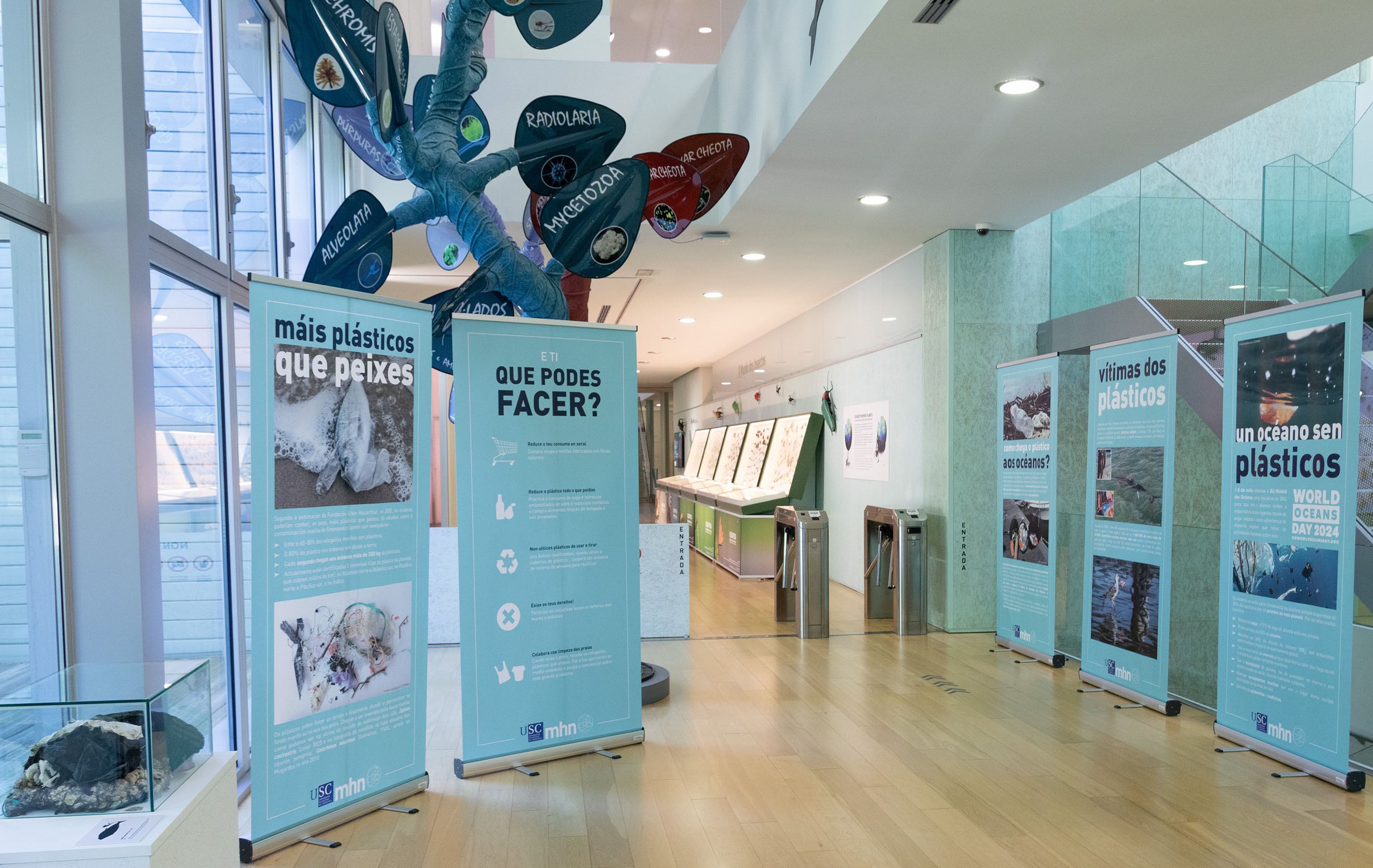 As salas do Museo de Historia Natural (MHN) da USC acollen este verán, ata finais de setembro, unha exposición temporal que trata o tema dos plásticos nos océanos e que estará aberta ao público con entrada de balde ata finais de setembro. Esta mostra pretende sensibilizar sobre este problema medioambiental para que se lembre a importancia das xigantes masas de auga e como advertencia do impacto negativo que teñen as actividades humanas sobre elas.