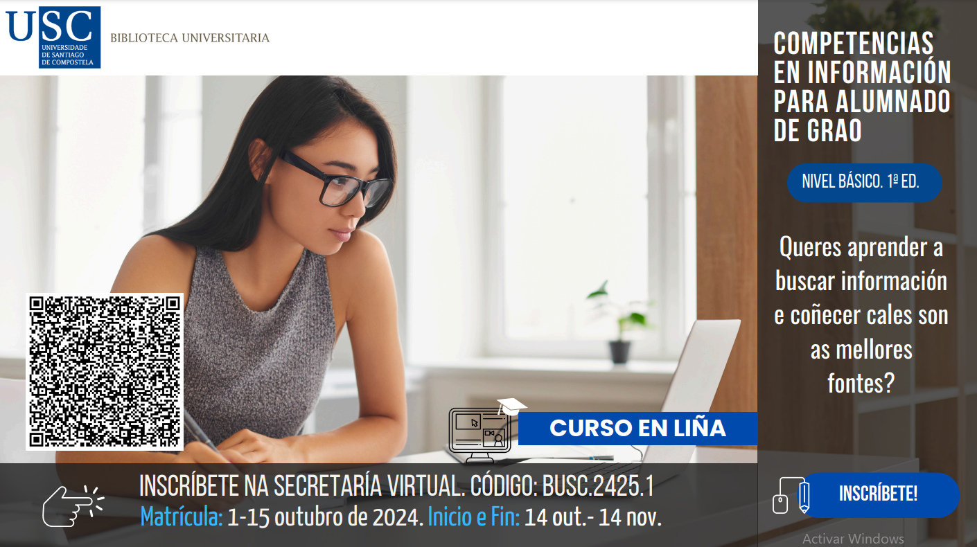 Desde hoxe e ata o día 15 de outubro está aberta a matrícula para o curso básico de Competencias en Información ofertado pola BUSC. Para o estudantado dos últimos cursos do grao, a BUSC contempla o curso de nivel avanzado, cuxo prazo de matrícula na primeira edición vai desde o 14 ata o 27 de outubro.