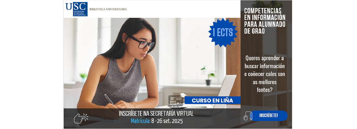 O luns 8 de setembro abrirase o prazo de matrícula para os cursos de Competencias en Información para alumnado de grao (nivel básico) e para o curso de Competencias en Información para TFG (nivel avanzado). A inscrición estará aberta ata o 26 de setembro.