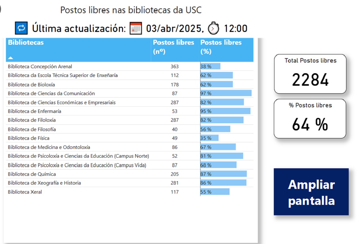 A BUSC vén de incluír dentro dos servizos que oferta a través da súa páxina web, a consulta da porcentaxe de ocupación dos distintos puntos de servizo, así como o número de postos libres dispoñibles periodicamente. Para acceder a esta información, é necesario entrar na páxina da biblioteca universitaria e picar no recadro Postos de lectura. Esta información tamén está dispoñible desde a app oficial da USC, no apartado Postos na BUSC da lapela Destacado.