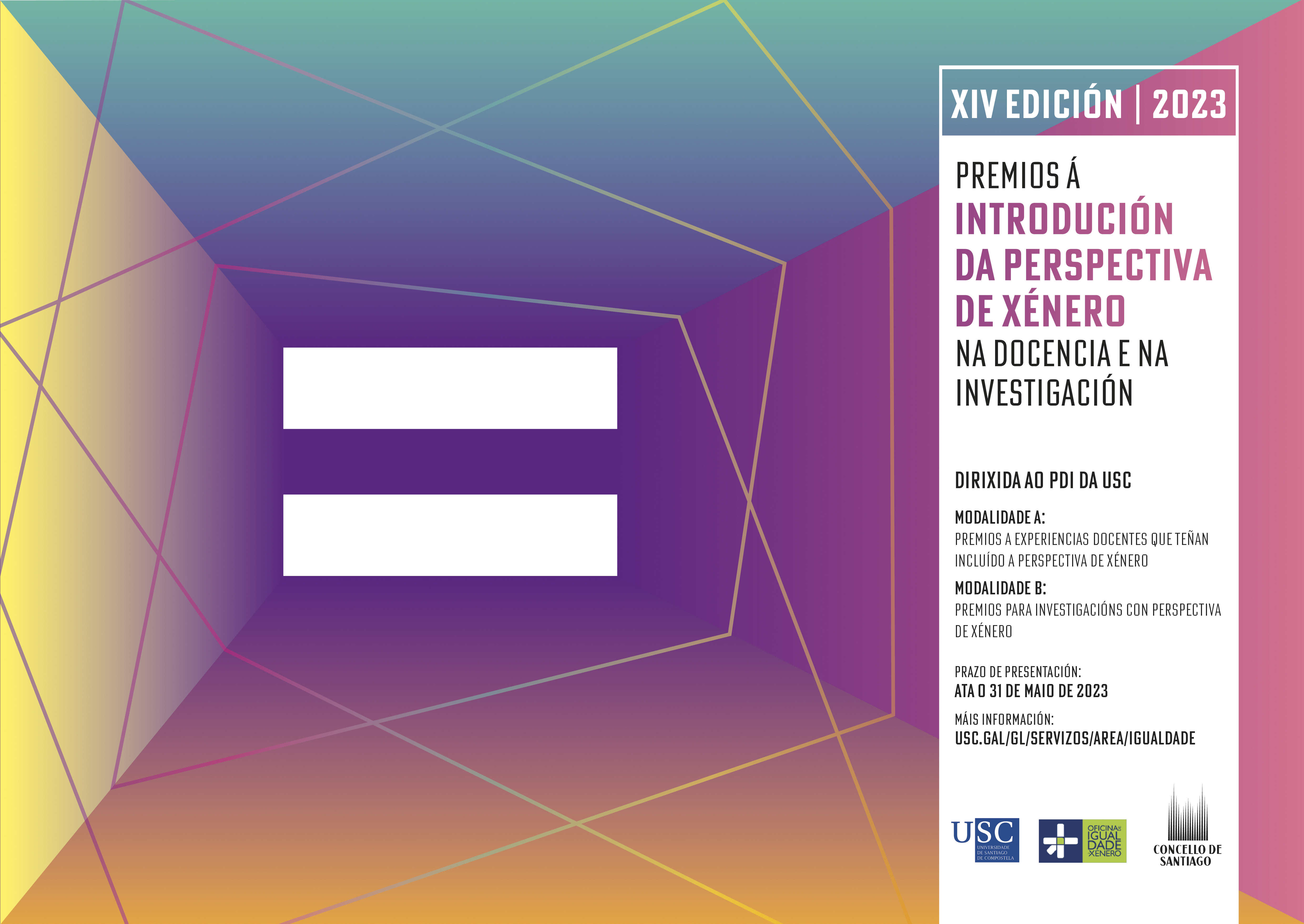 A USC convoca os Premios á Introdución da Perspectiva de Xénero na Docencia e na Investigación coa finalidade de fomentar a introdución da perspectiva de xénero na docencia e na investigación —considerada como unha dimensión de calidade e innovación docente dos nosos centros, institutos e departamentos. Os premios están financiados polo Concello de Santiago de Compostela