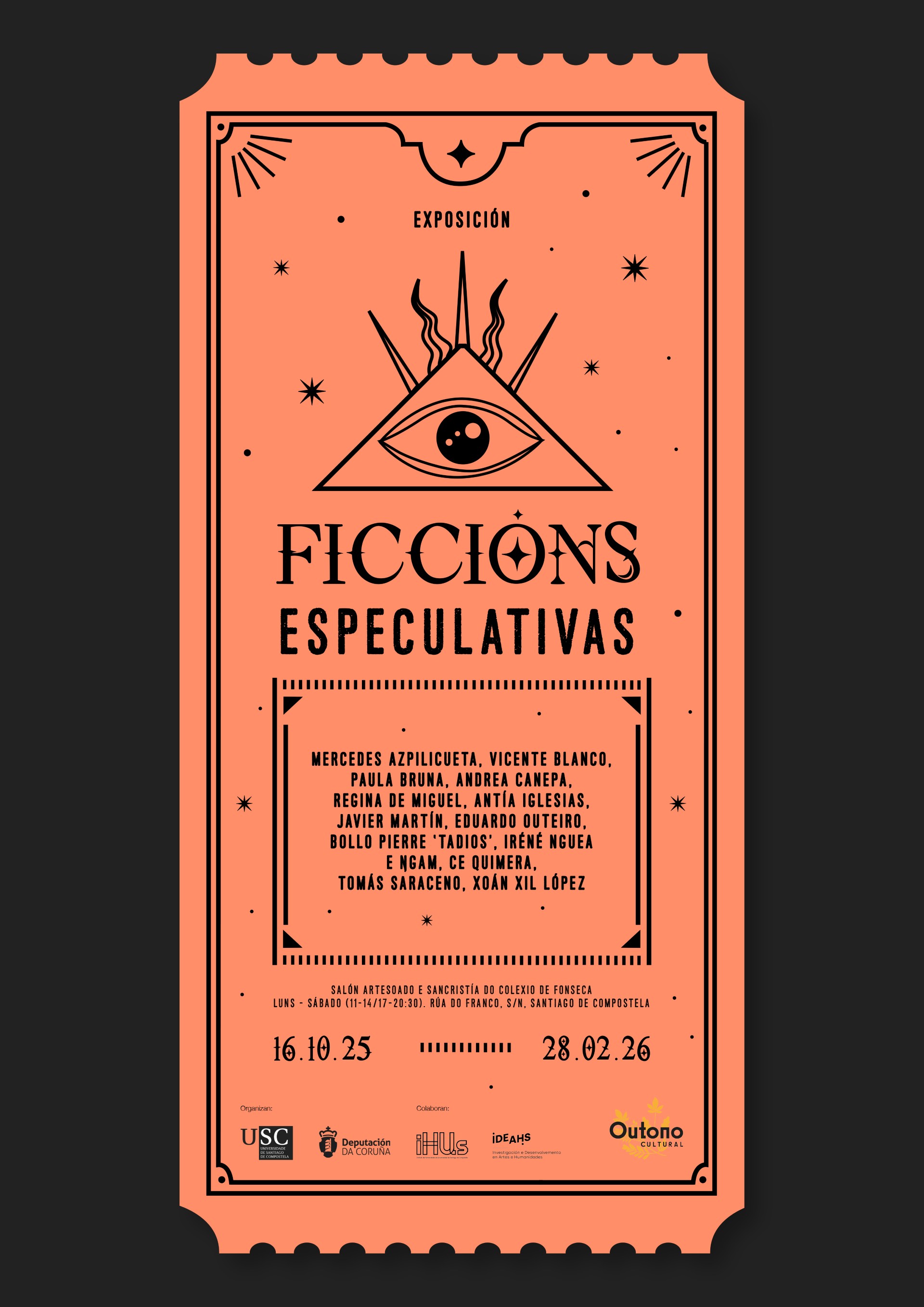 O histórico Salón Artesonado do Colexio de Fonseca acolle a exposición ‘Ficcións especulativas’, unha mostra colectiva que explora como os artistas contemporáneos utilizan a ciencia ficción, os soños e os oráculos como ferramentas para construír visións alternativas do mundo e do porvir. Propón deste xeito unha viaxe para transformar a incerteza do presente en pulo creativo.