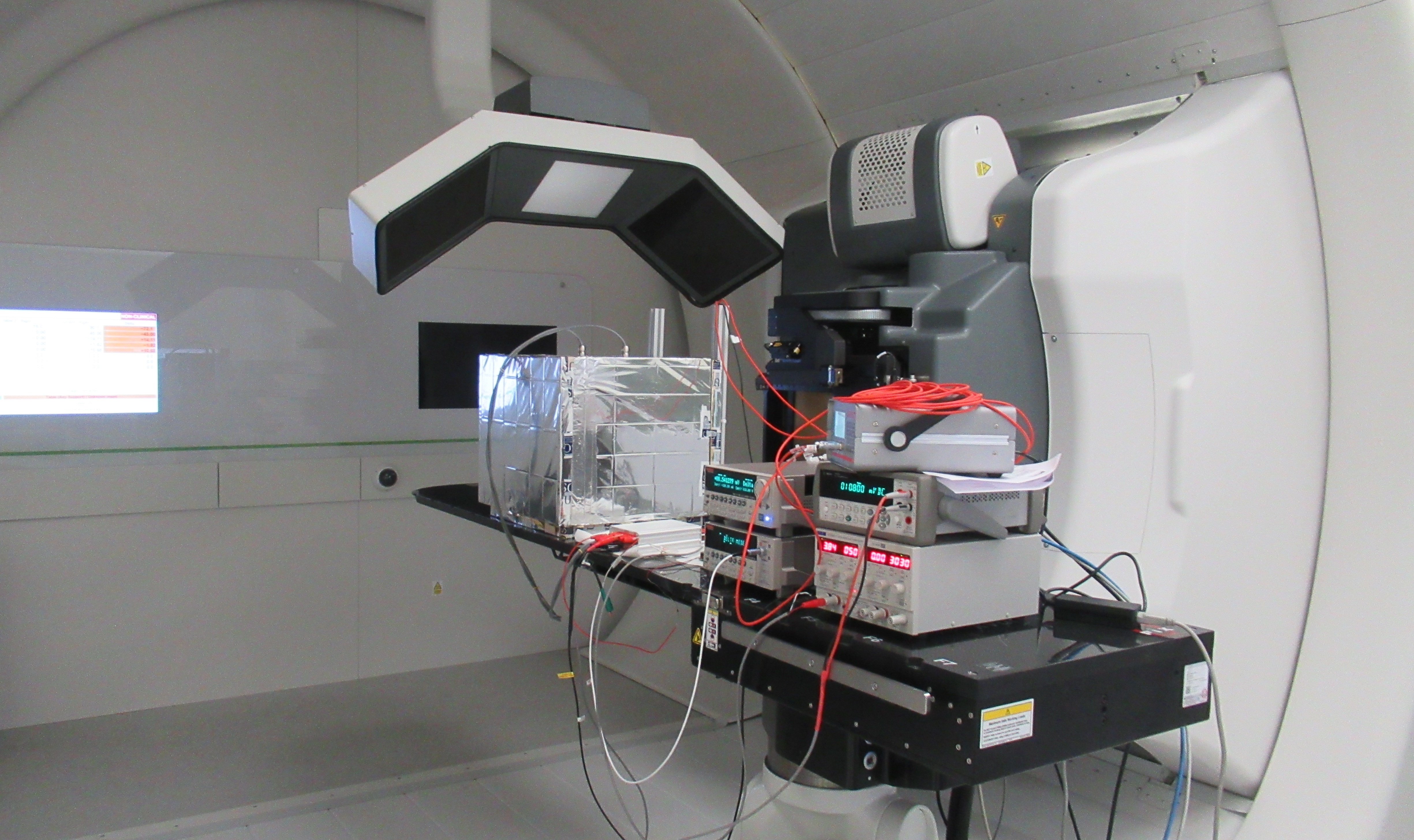 A taxa de dose absorbida na mostra a irradiar monitorízase en tempo real mediante unha cámara de ionización de aire conectada a un electrómetro de referencia. A resposta da cámara de ionización convértese en tempo real en taxa de dose no material da mostra ou compoñente.