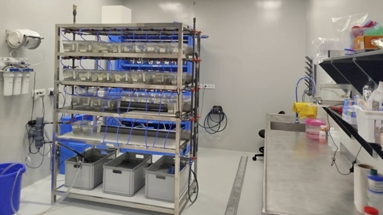 Sistema modular de aceiro inoxidable con estantería dobre: Composto por 38 puntos de toma de auga, este sistema funciona cun circuito de recirculación pechada que incorpora filtración mecánica, biolóxica e ultravioleta, garantindo condicións óptimas para os animais. A súa capacidade é de 900 individuos adultos.