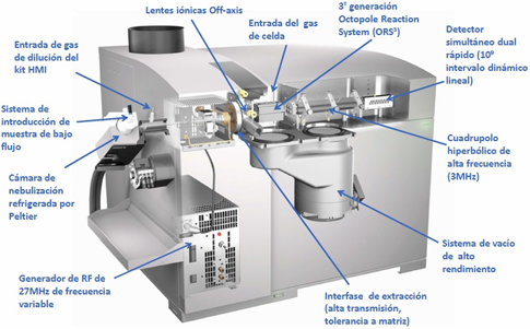 O ICP-MS inclúe un sistema de introdución de mostra que consiste nunha cámara do spray con arrefriamento por sistema Peltier, un nebulizador microconcéntrico, un analizador de masas de tipo cuadrupolar.